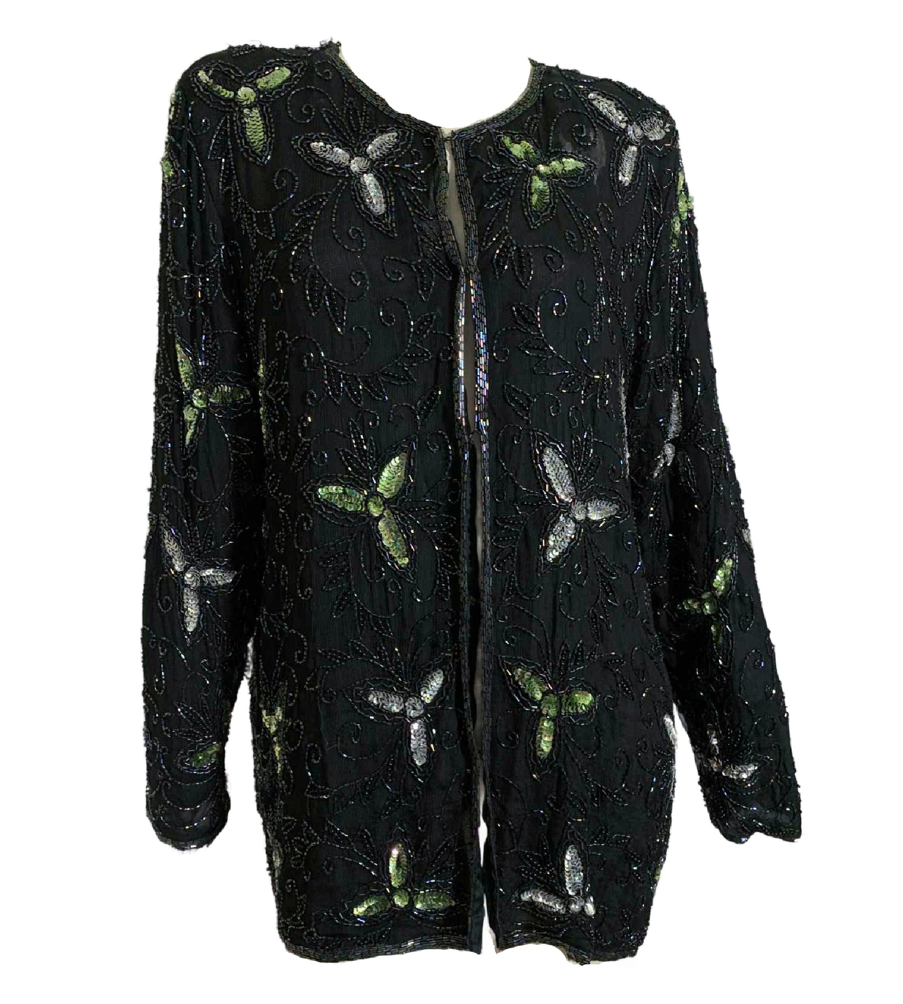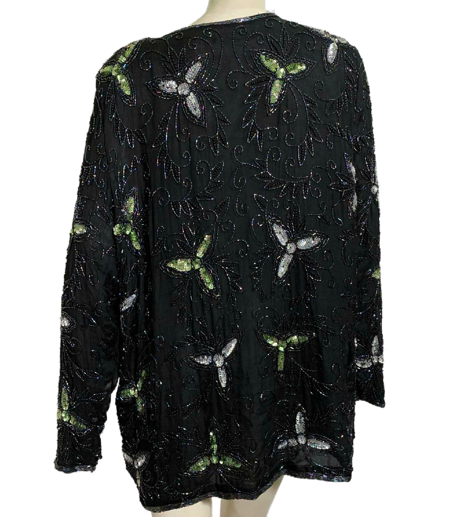 Dark midnight blue beaded silk 1980s-early 90s jacket by BHOLA imports. Hook and eye closure down front, iridescent silver and green sequined accents. Size 1XL, no flaws.