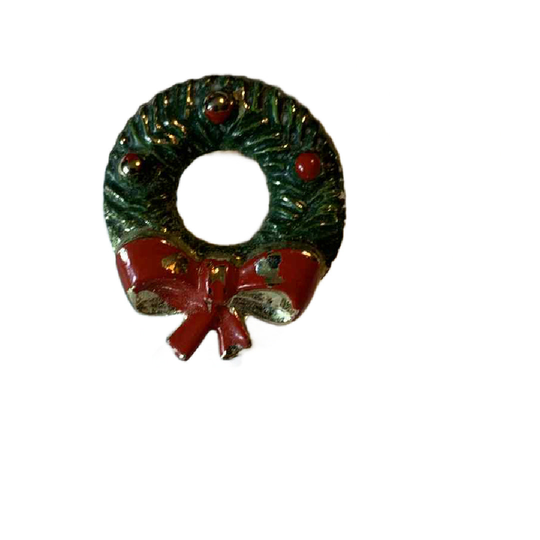 Mini Green Enameled Metal Holiday Wreath Brooch circa 1960s