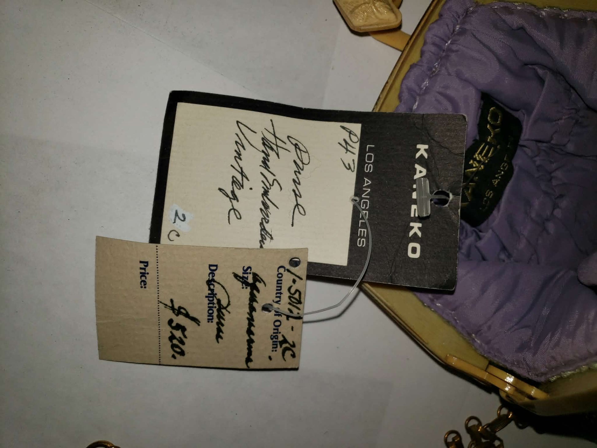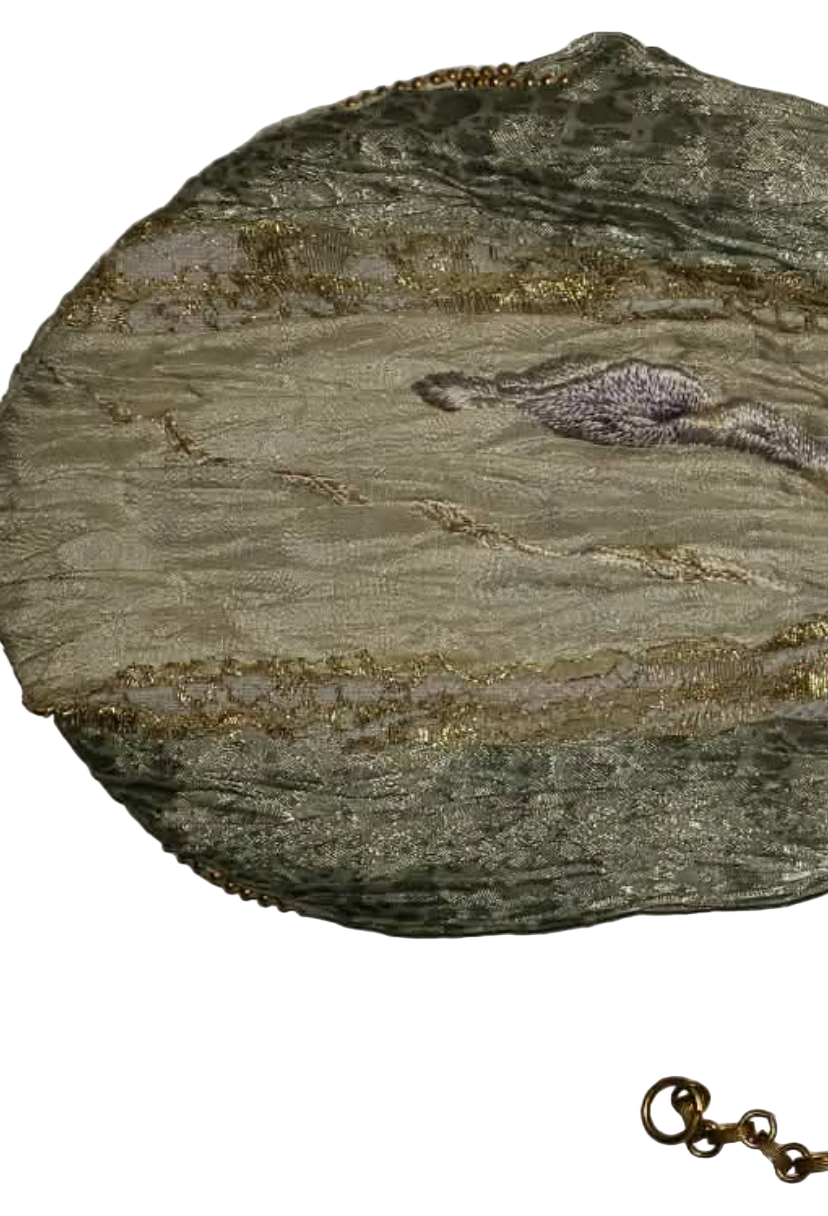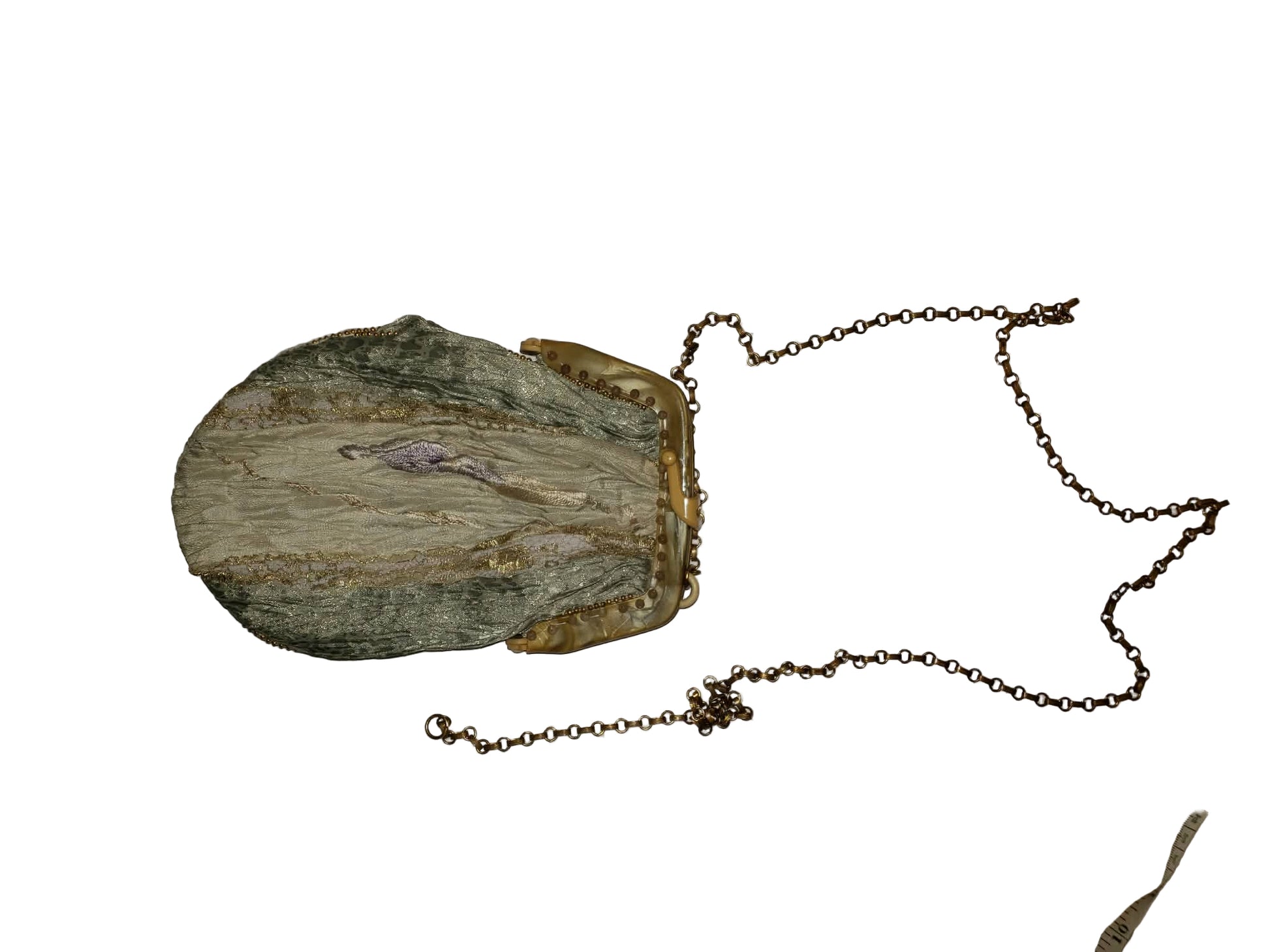 Incredible 1920s style bag by artist Janet Kaneko, part of the art-to-wear scene in Los Angeles in the 60s and 70s. Known for her use of kimono textiles and pleating, her works are rare and hard to find these days- her studio burned years ago leaving little left in the world. This bag is missing a hook for one side of the chain but otherwise perfect- still has store tags and original price. 9” long not including chain, 6” wide.