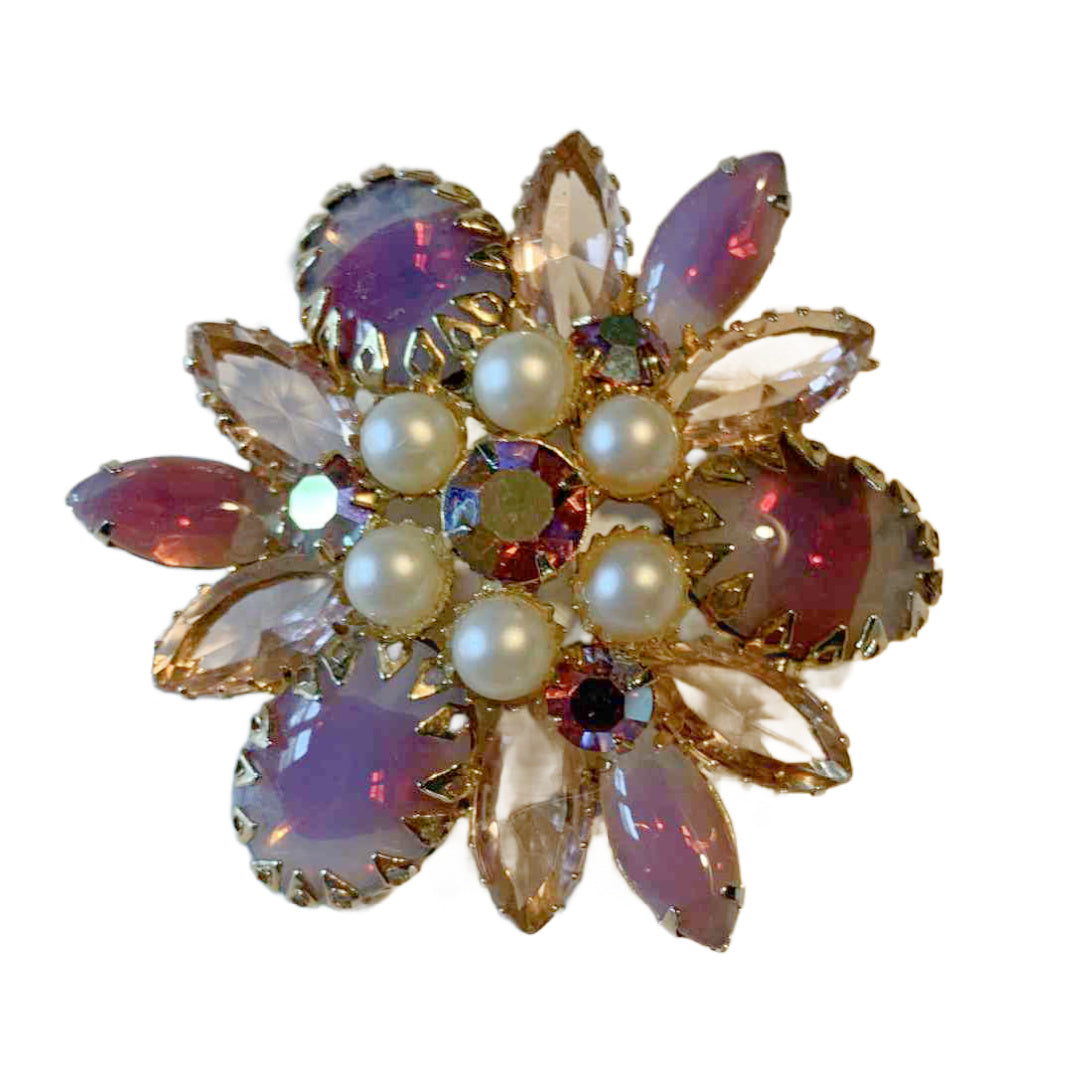 Opalescent Pink Cabochon and Rhinestone Flower Brooch circa 1960s