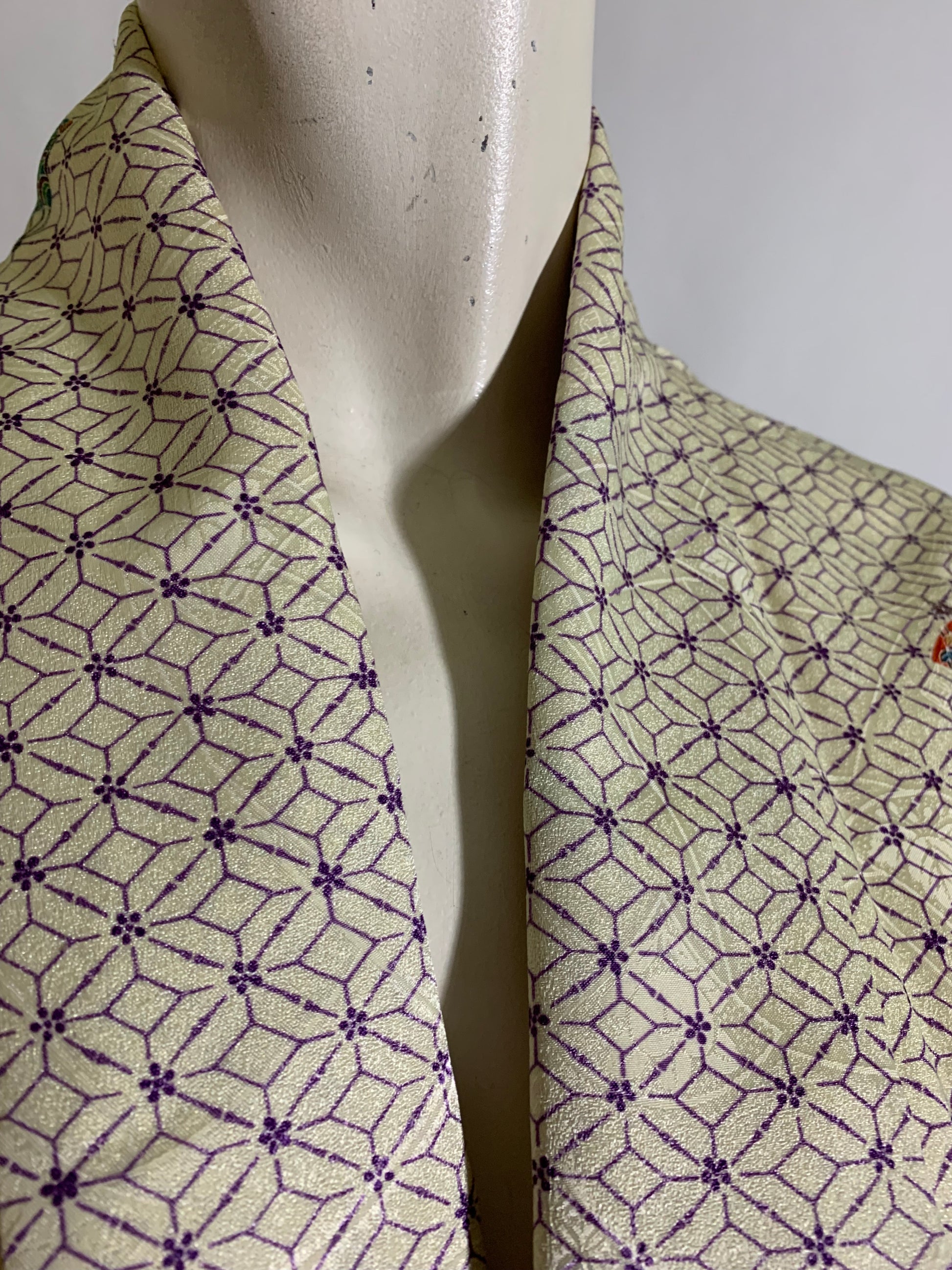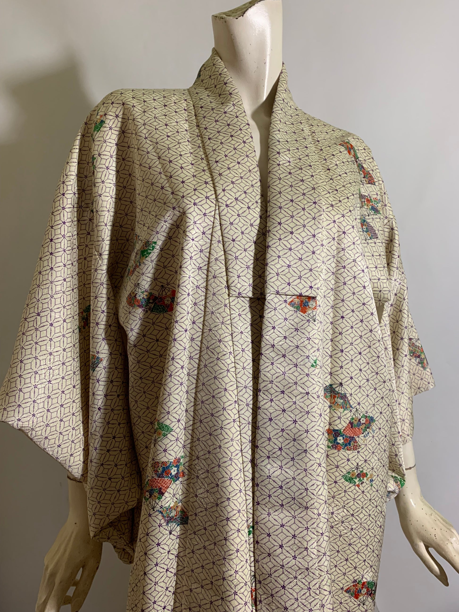 Silk kimono in ivory with pastel print of parasols. Lining dyed pink inside edges and hem. No flaws, no label. 62" long.