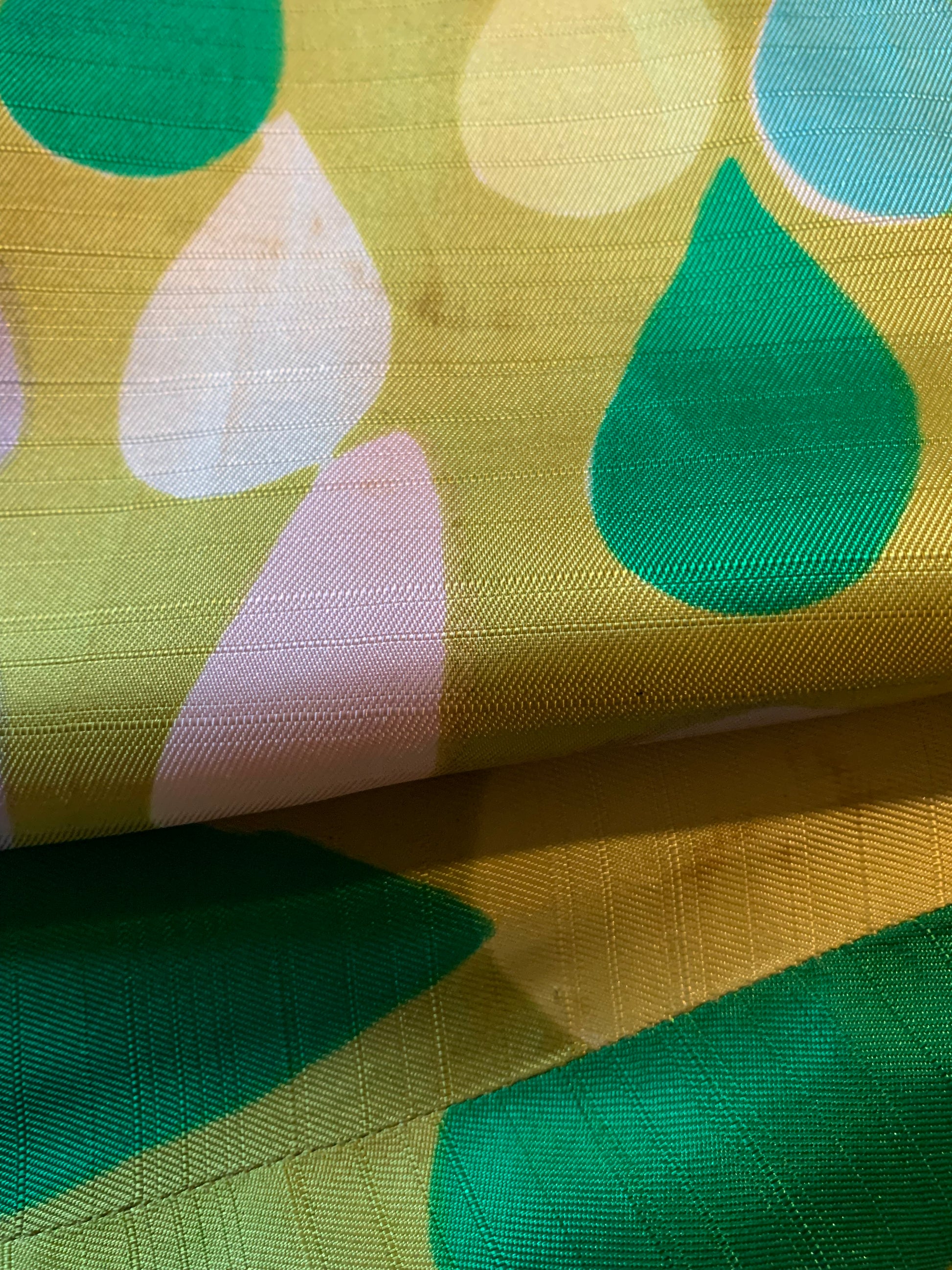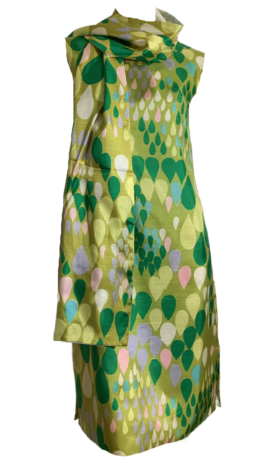 Glorious pastel raindrop print sheath dress with wide sash/scarf. Acetate rayon, lined, back metal zipper. Sash is lined in white on reverse. No label, a couple small spots one on left hip and one sash. Very minor and hard to spot.