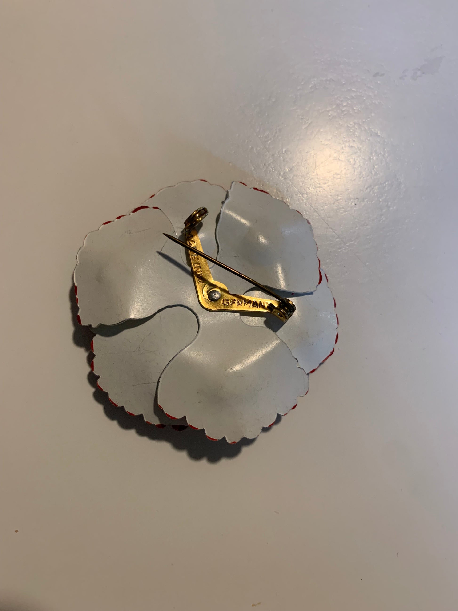 White enameled flower brooch with red and blue accents. 2 1/4". Made in Germany, no flaws.