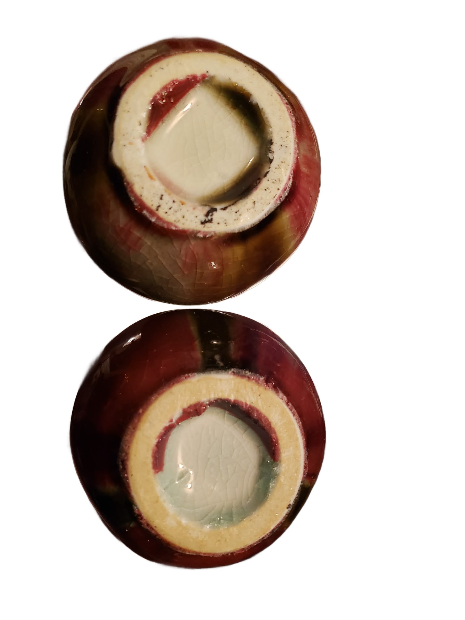 5" tall, some crazing to porcelain. Gorgeous colors in the traditional flambé style.