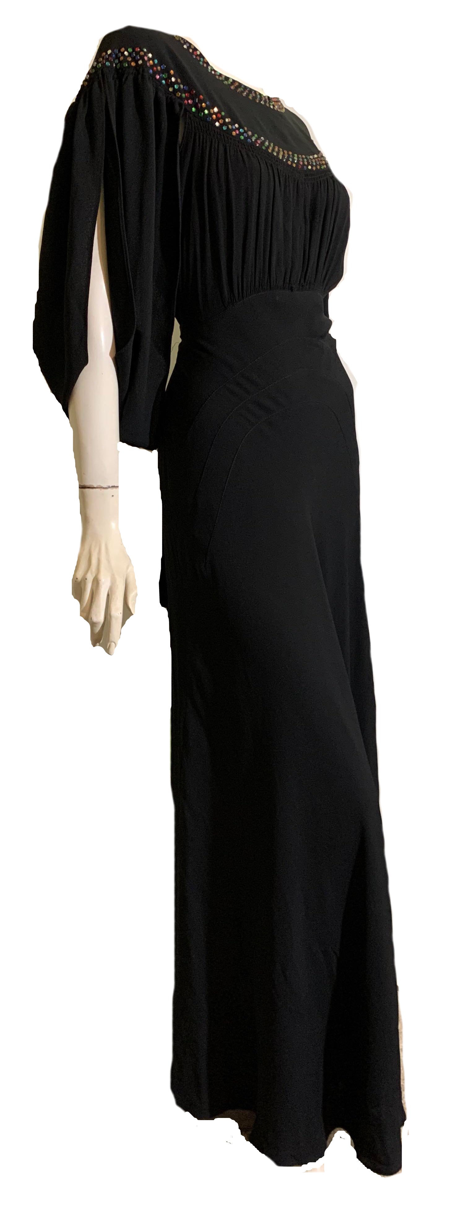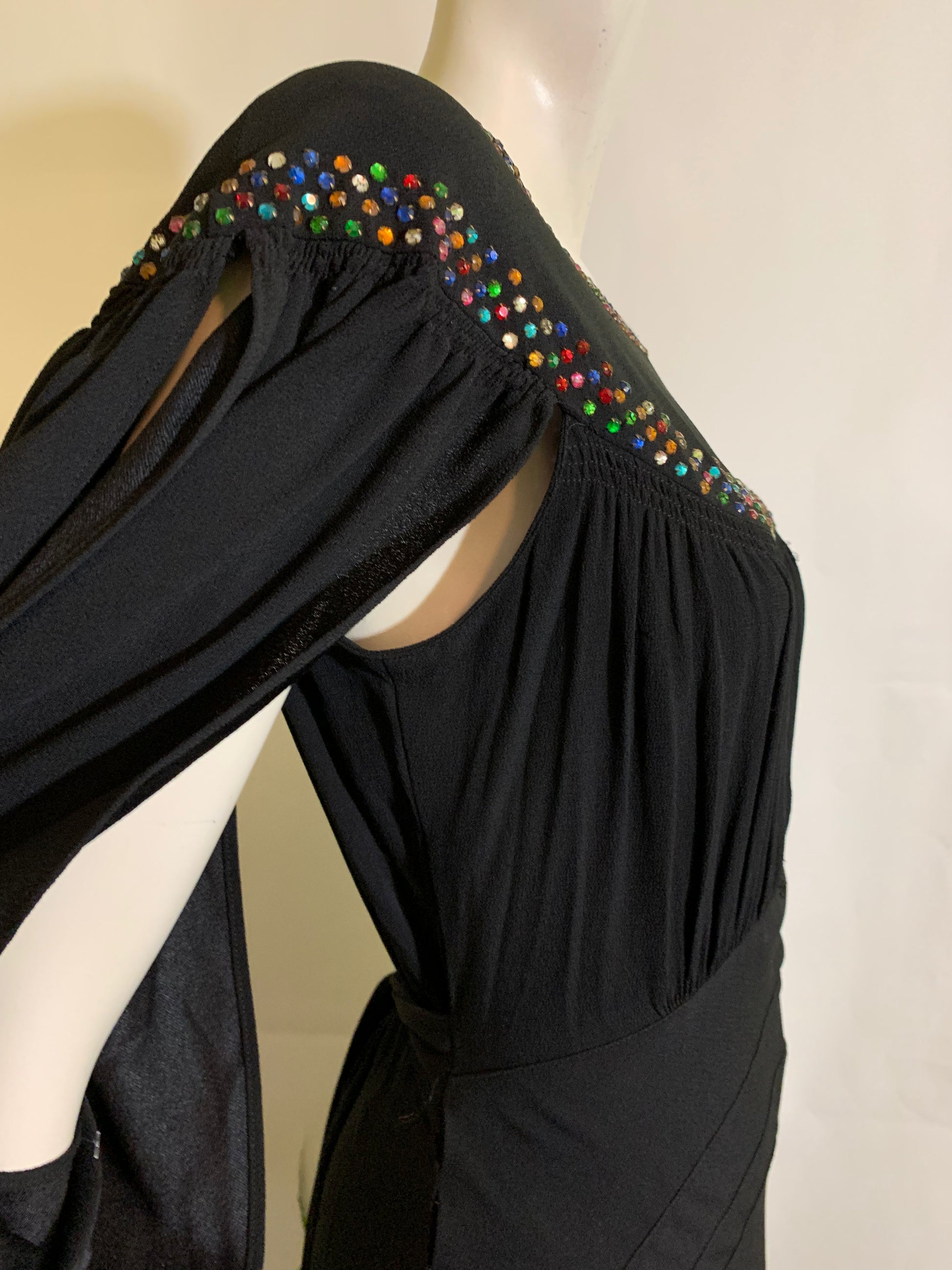 RESERVED Rainbow Vamp! Black Crepe Evening Gown with Rainbow Rhinestones and Side Slit Sleeves and Back circa 1930s