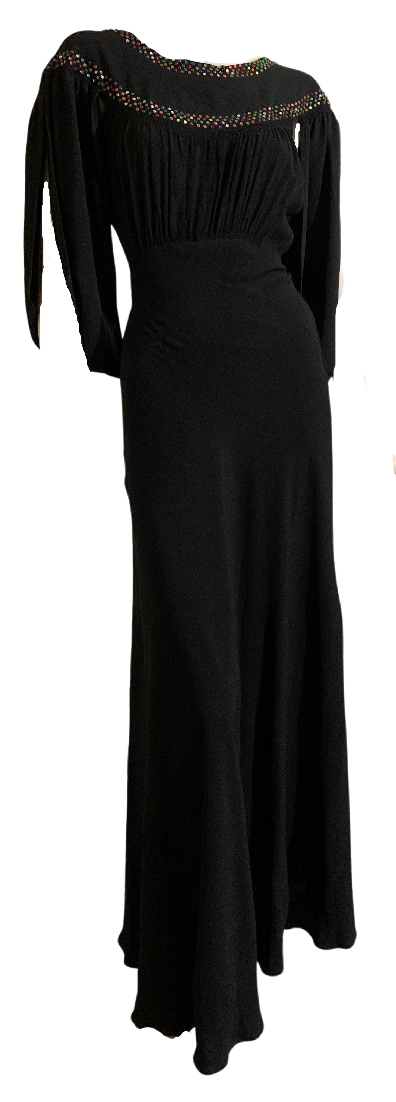 Glorious deep black satin back crepe rayon evening gown with deco seaming at waist, sash tie in back- side metal snaps. Neckline is studded with multicolored prong set rhinestones around front and back- sleeves loop around arm to create slit up side, small slit in back of bodice as well. No label, no flaws.