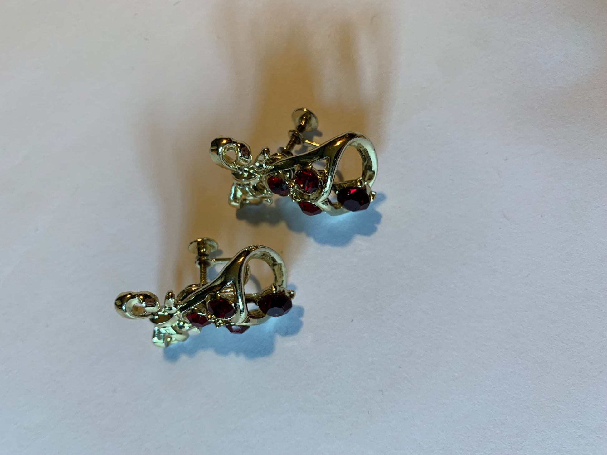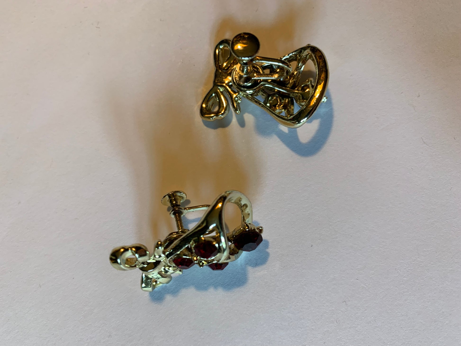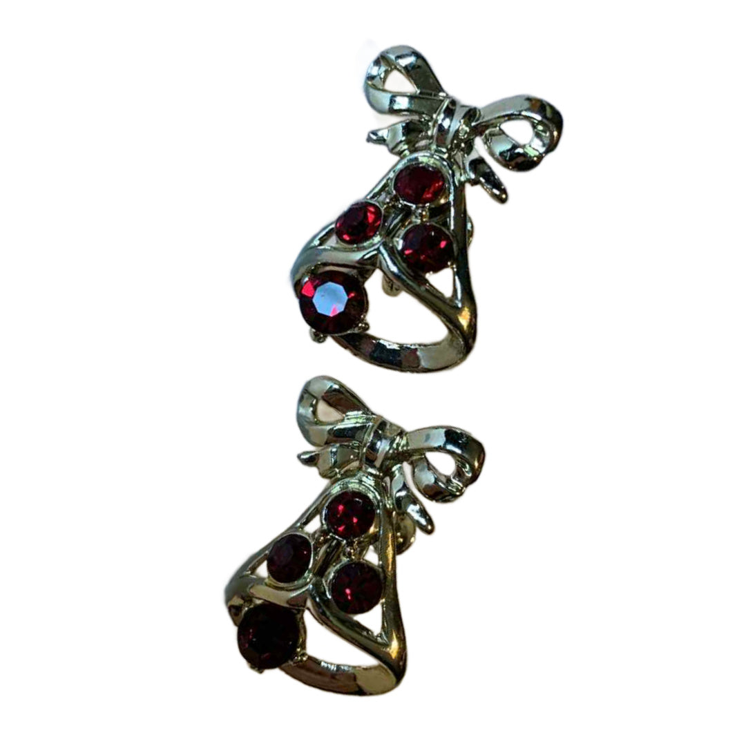 1 1/4" gold tone metal screw back clip bell earrings with moveable clappers and vivid red rhinestones. No markings, no flaws.