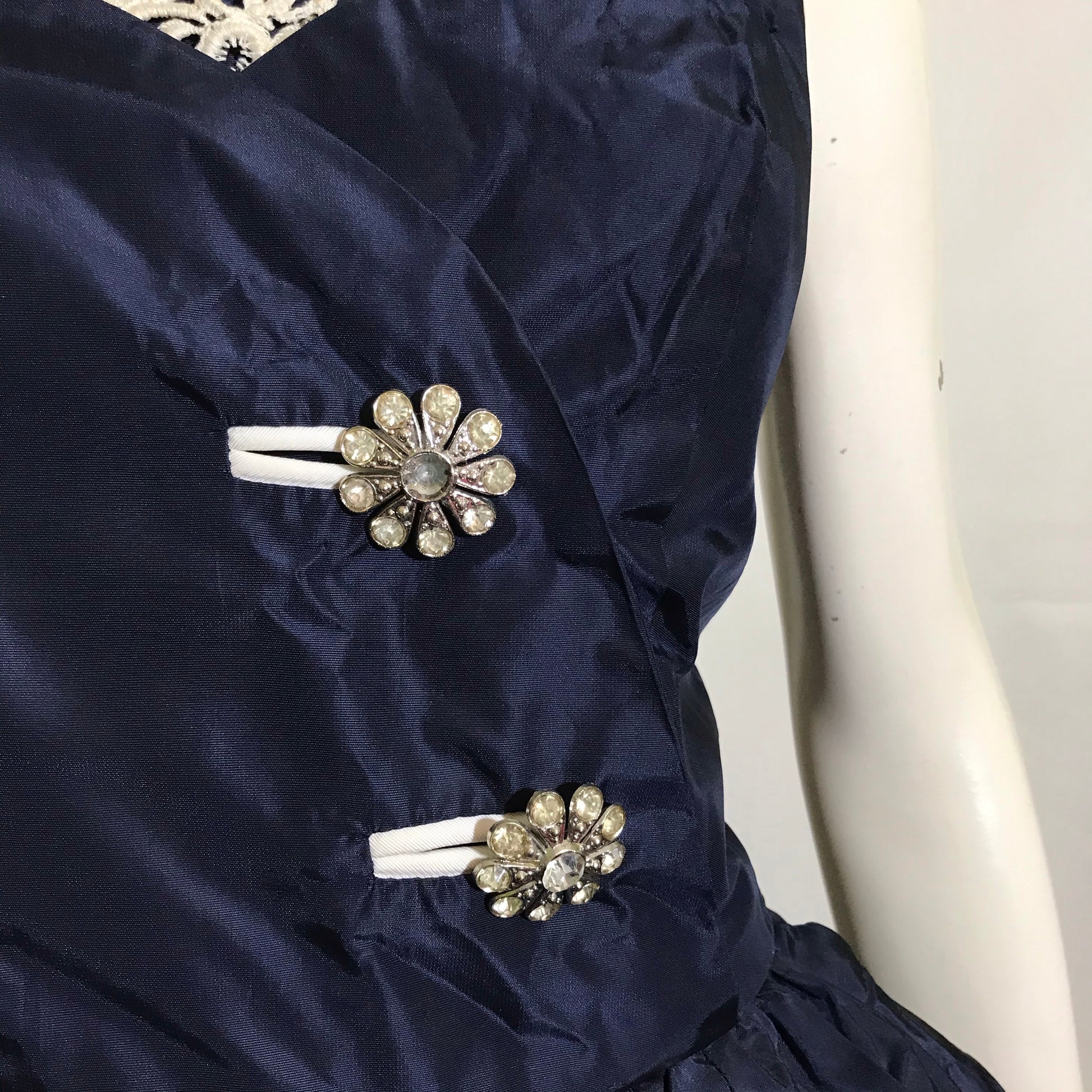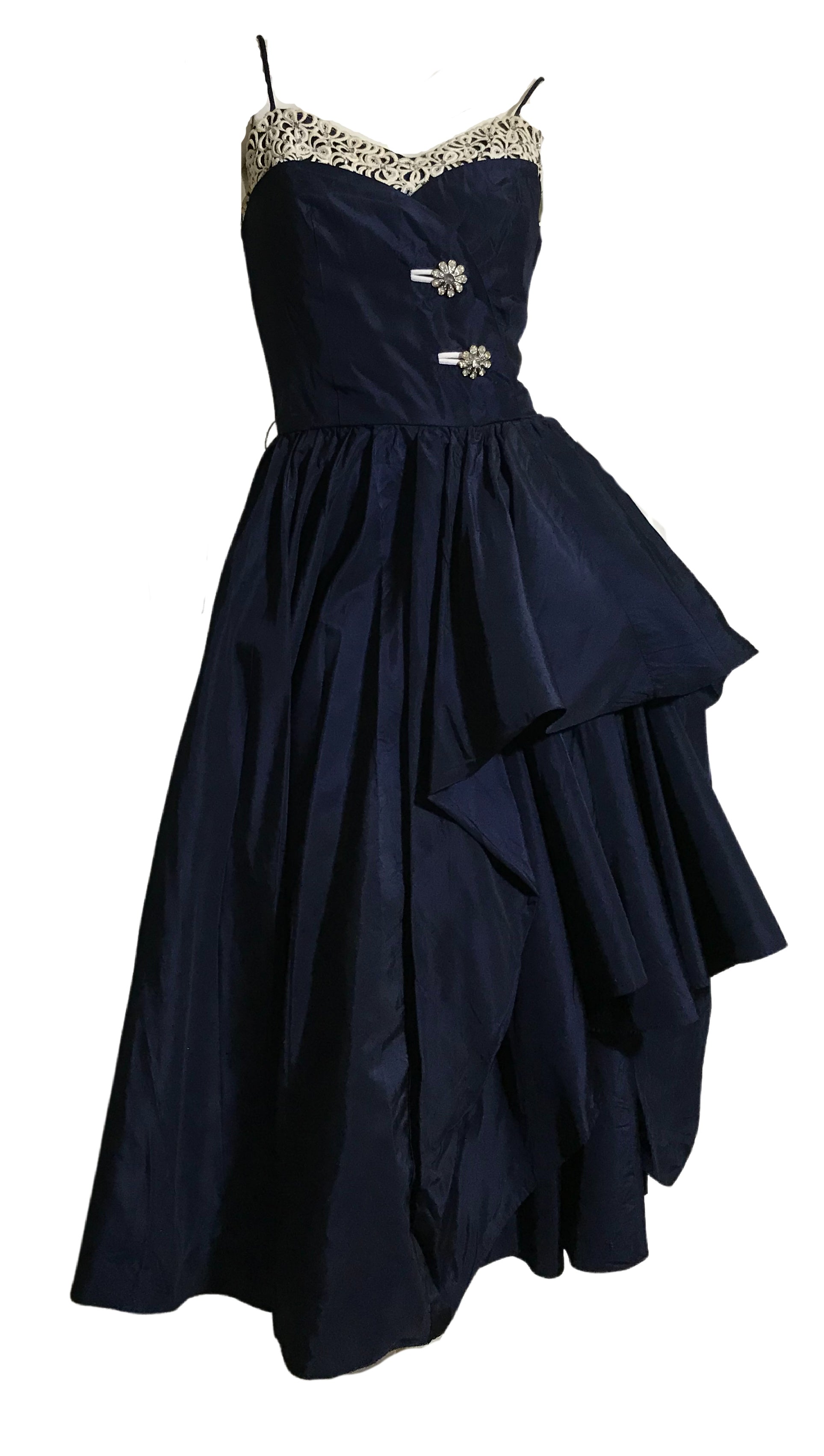 Gorgeous late 1940s deep blue acetate taffeta cocktail dress. Spaghetti straps on lace trimmed bodice with 2 rhinestone button accents. Left side of dress has tiered and swagged skirt. Side metal zipper, bodice is boned. Minor wear, has a light spot toward hem on right as shown. No label.