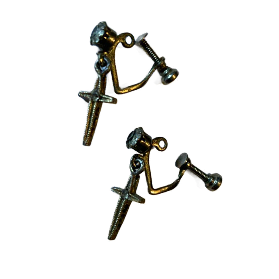 Rhinestone Dotted Cross Dangling Screwback Clip Earrings circa 1940s