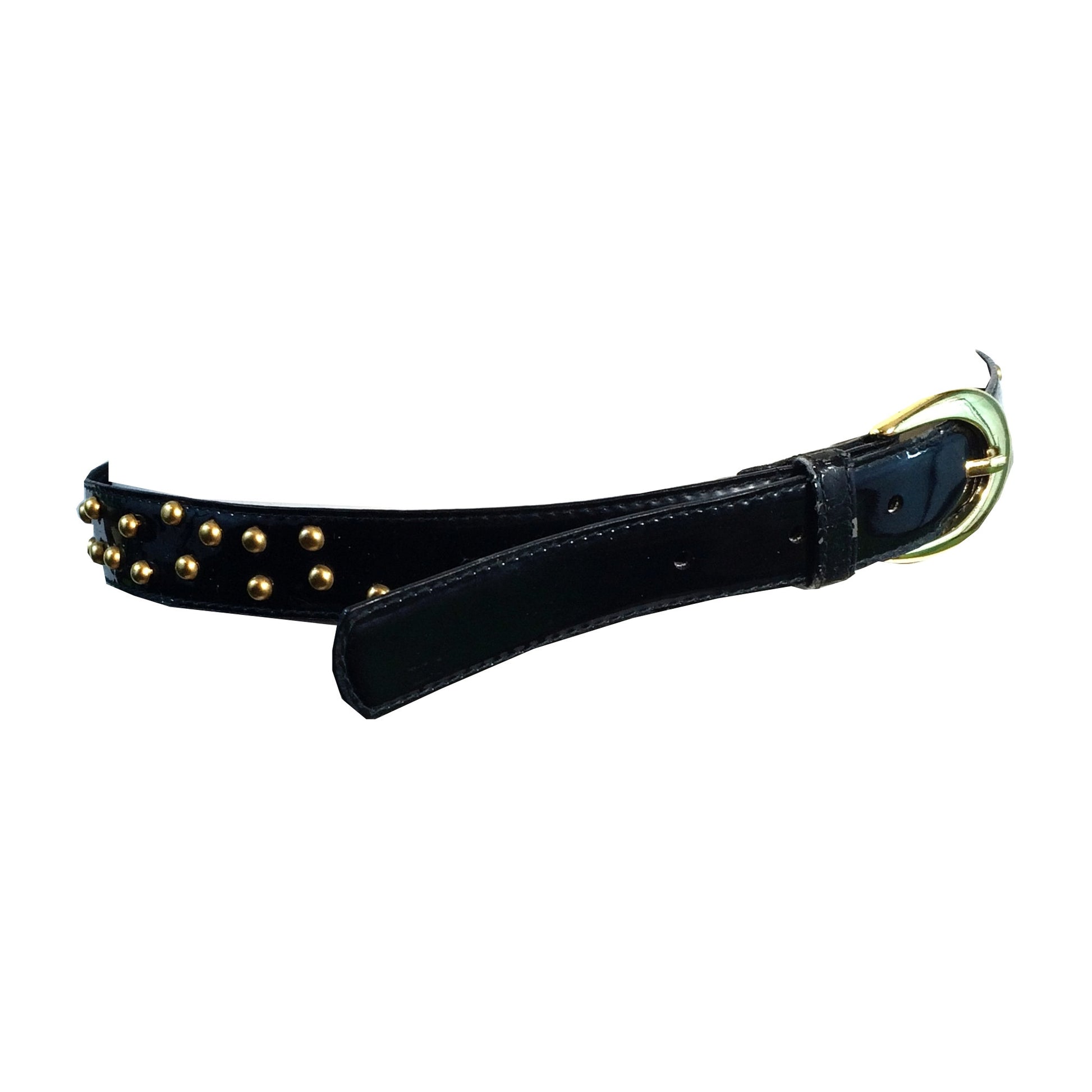 Black patent vinyl narrow belt with gold tone metal studs around sides and back. By Crown Pacific. Minor wear.