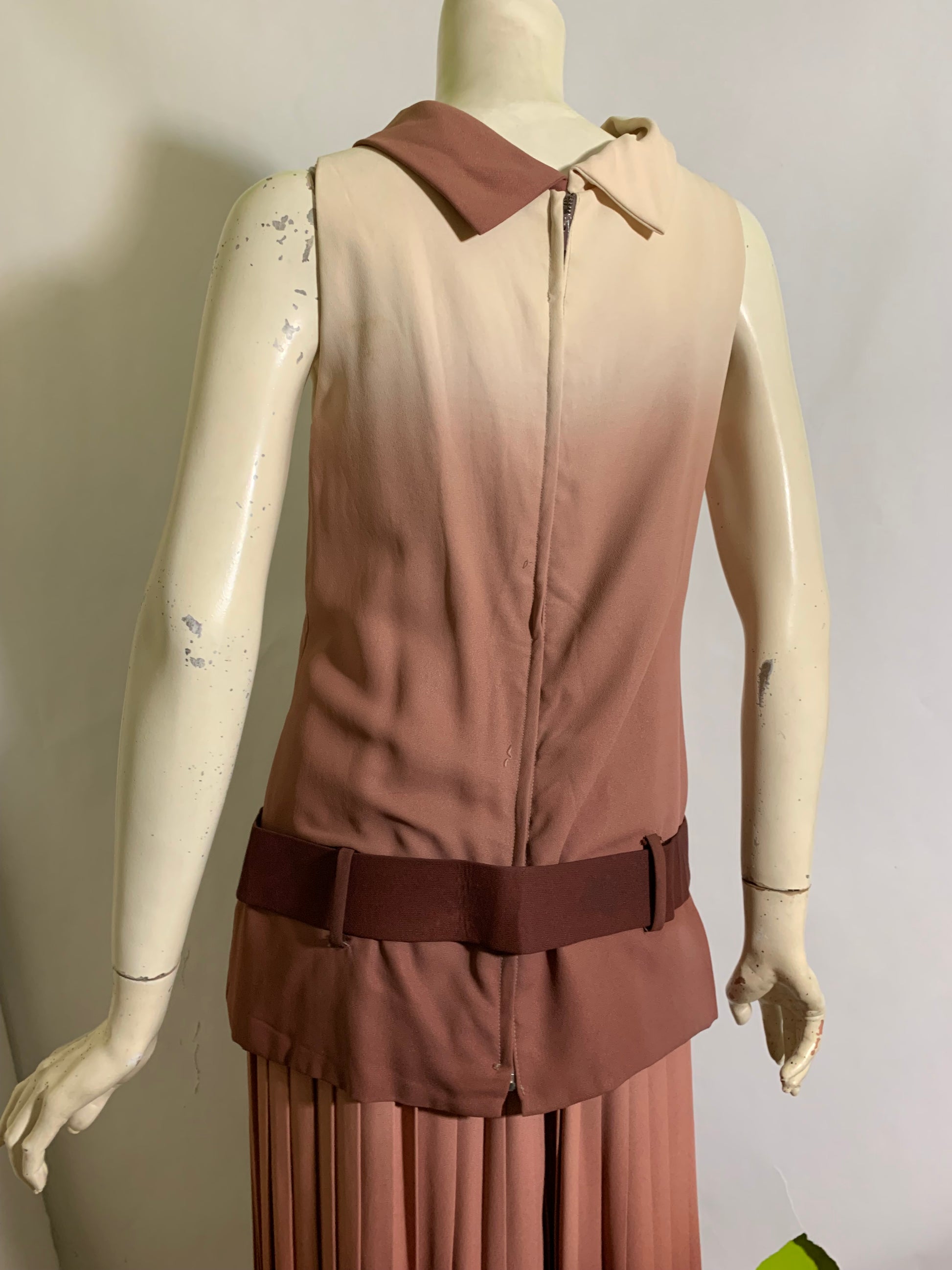 Rosy caramel crepe rayon palazzo pants "dress" with ombré coloring. Sleeveless, rolled neckline. Long "top" over pleated palazzo pants, bodice has 2 layers. Spot on upper right bodice, likely from a brooch- could be covered with another brooch! No label.