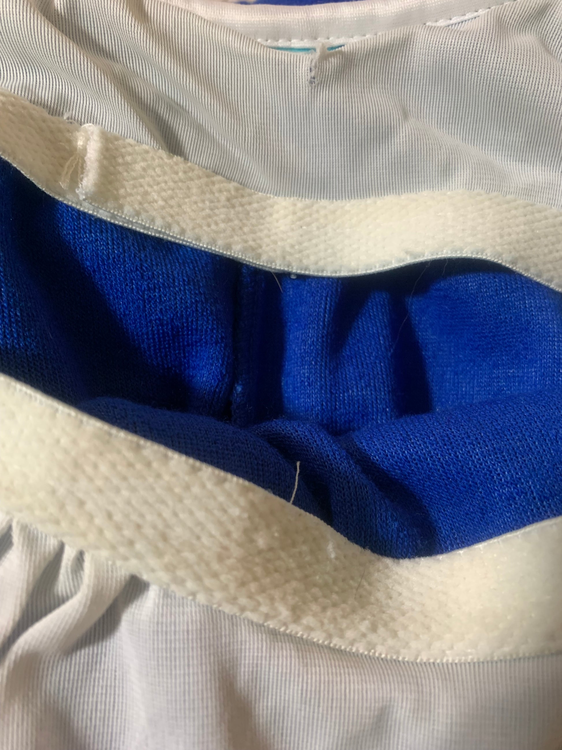 Early 1980s royal blue cotton terry clothing summery "swim dress"- lined bust with elastic at bottom, adjustable straps. White trim and sash. Right hip pocket. No flaws. No label.