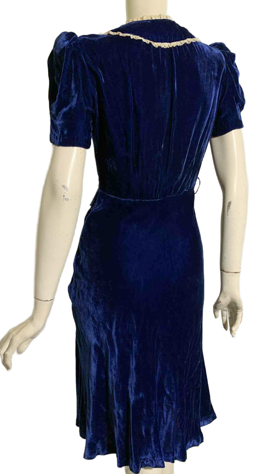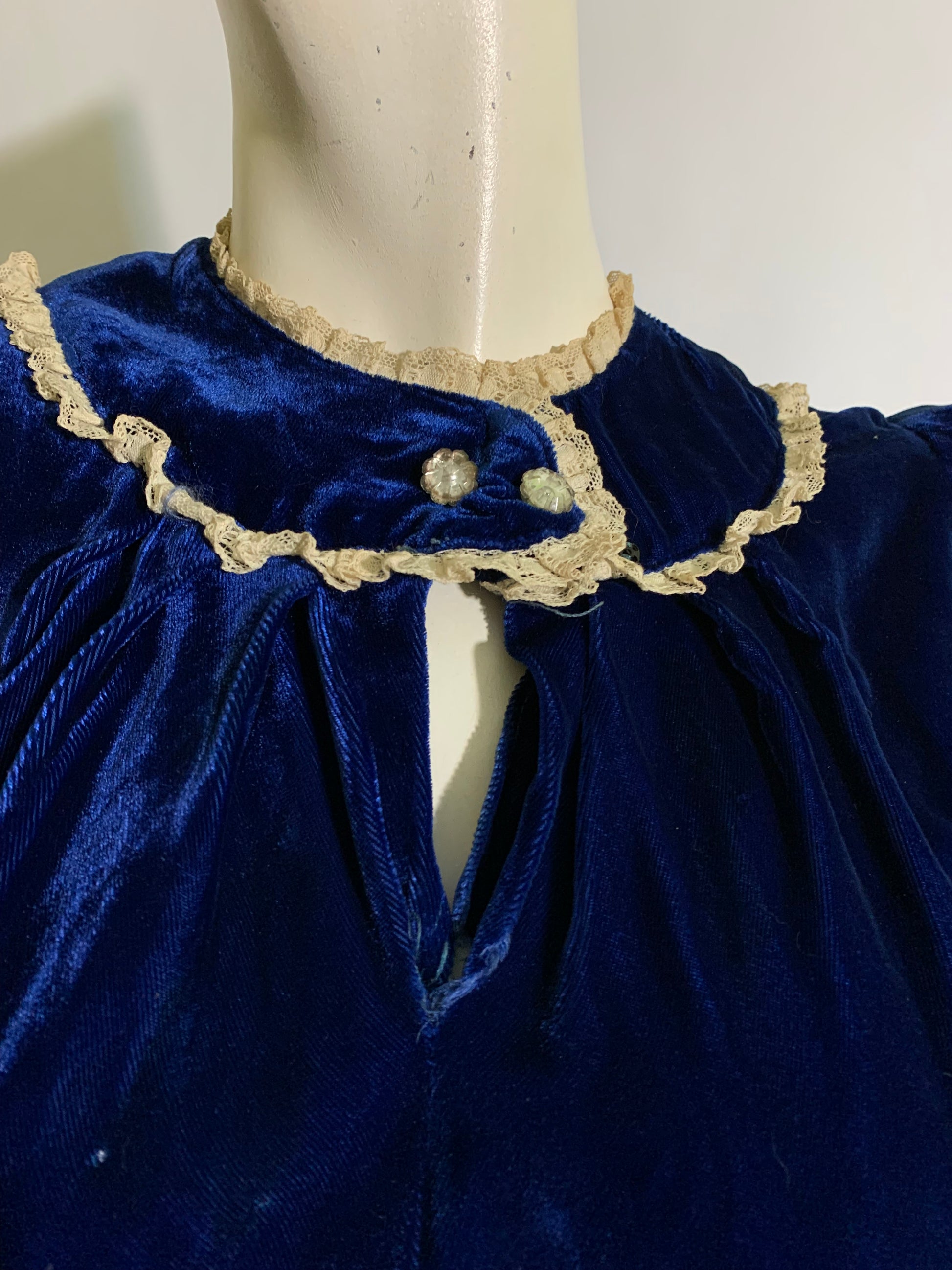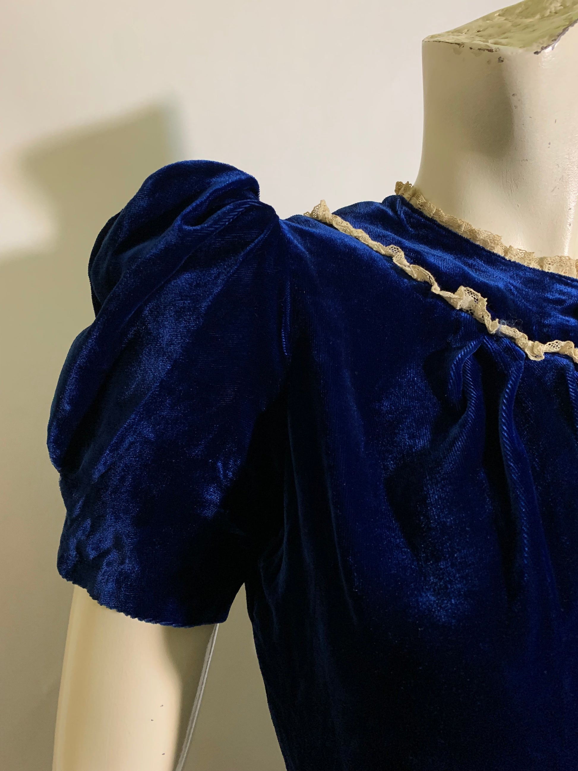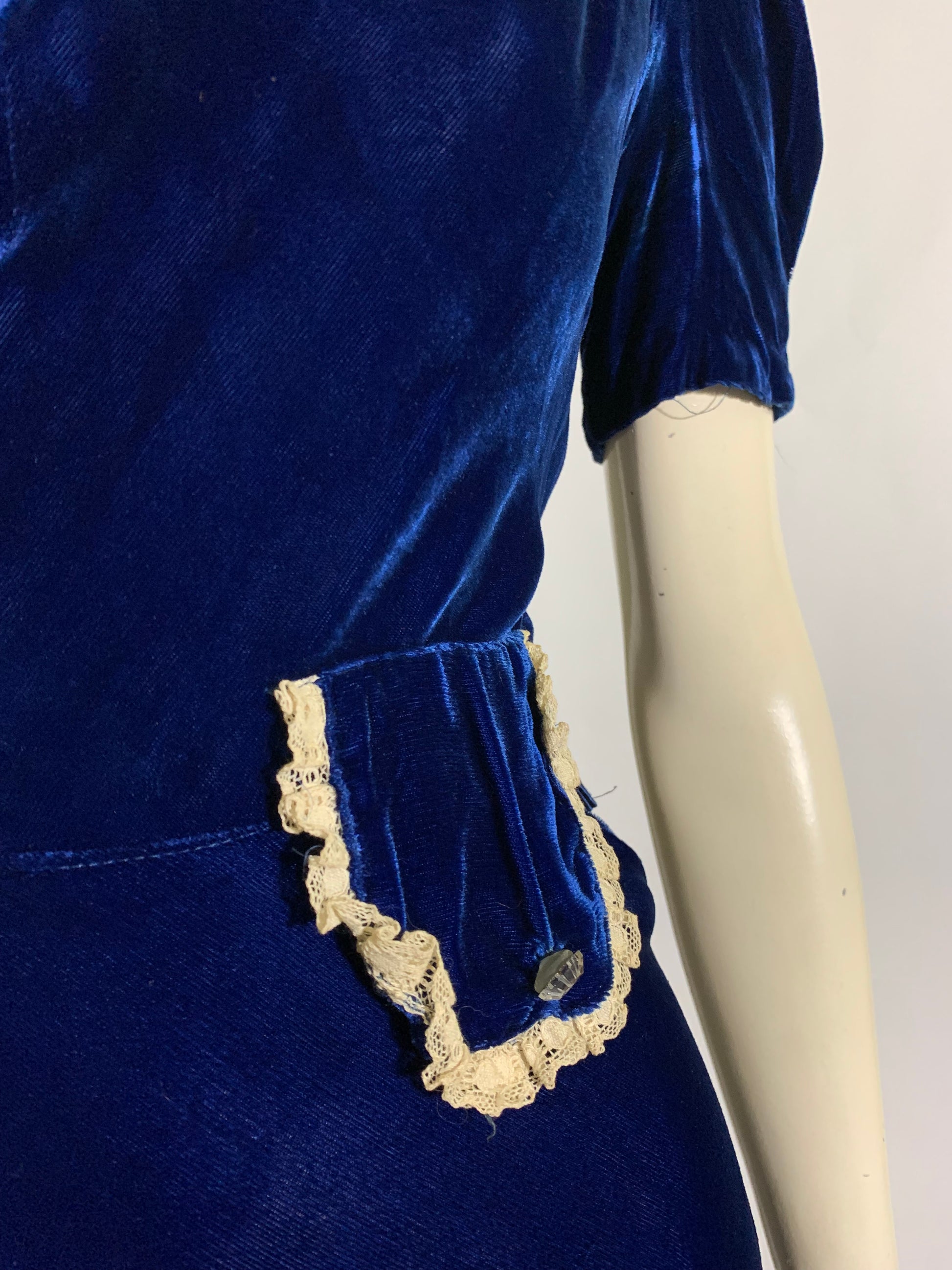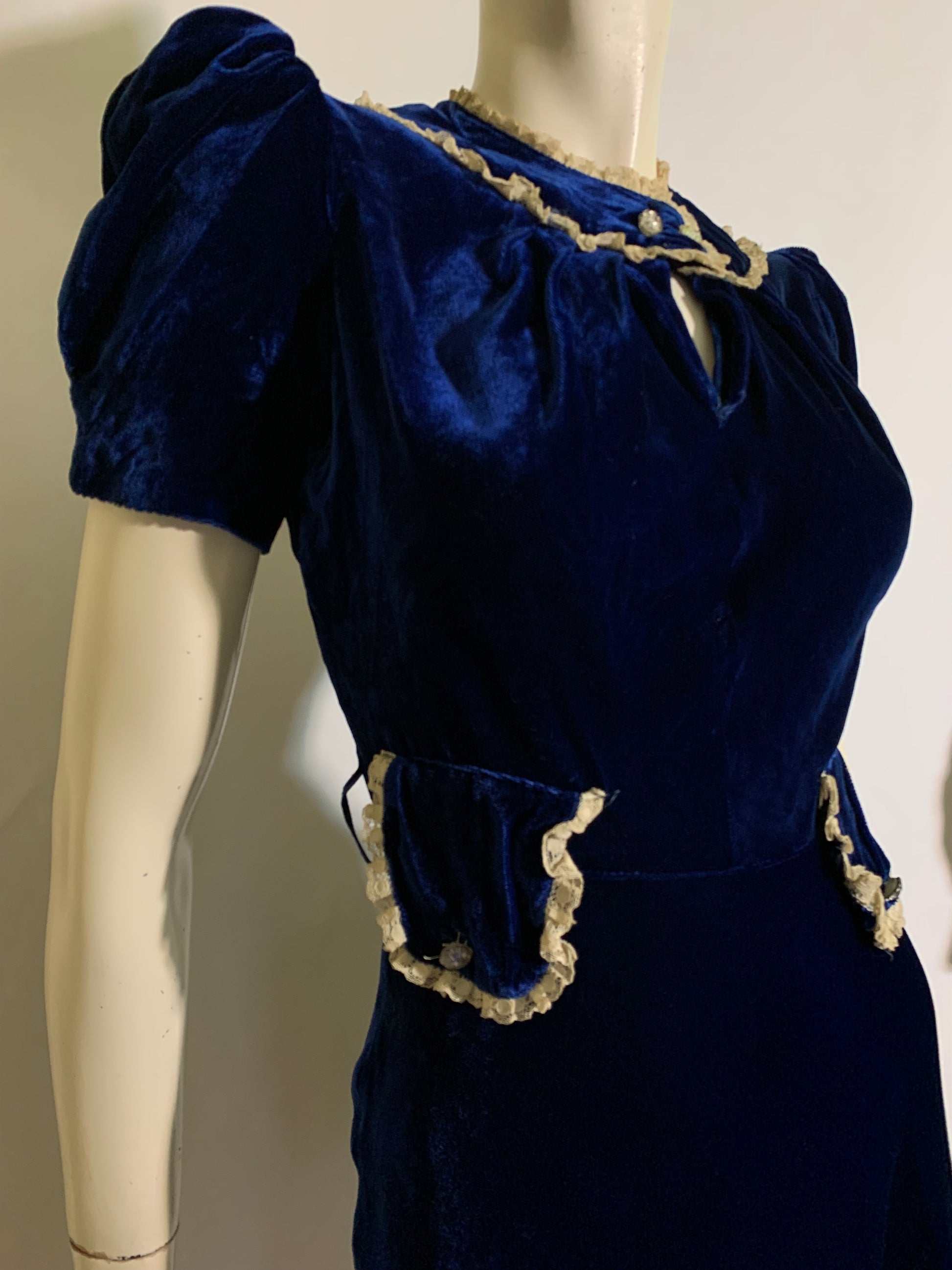 Young woman's 1930s vivid blue silk velvet dress with puffed sleeves, keyhole neckline, glass button accents at rounded "collar"- snaps behind. Button accents on lace trimmed faux hip pockets, side metal snaps. No label, likely hand made. Note measurements, short torso. No holes or stains.