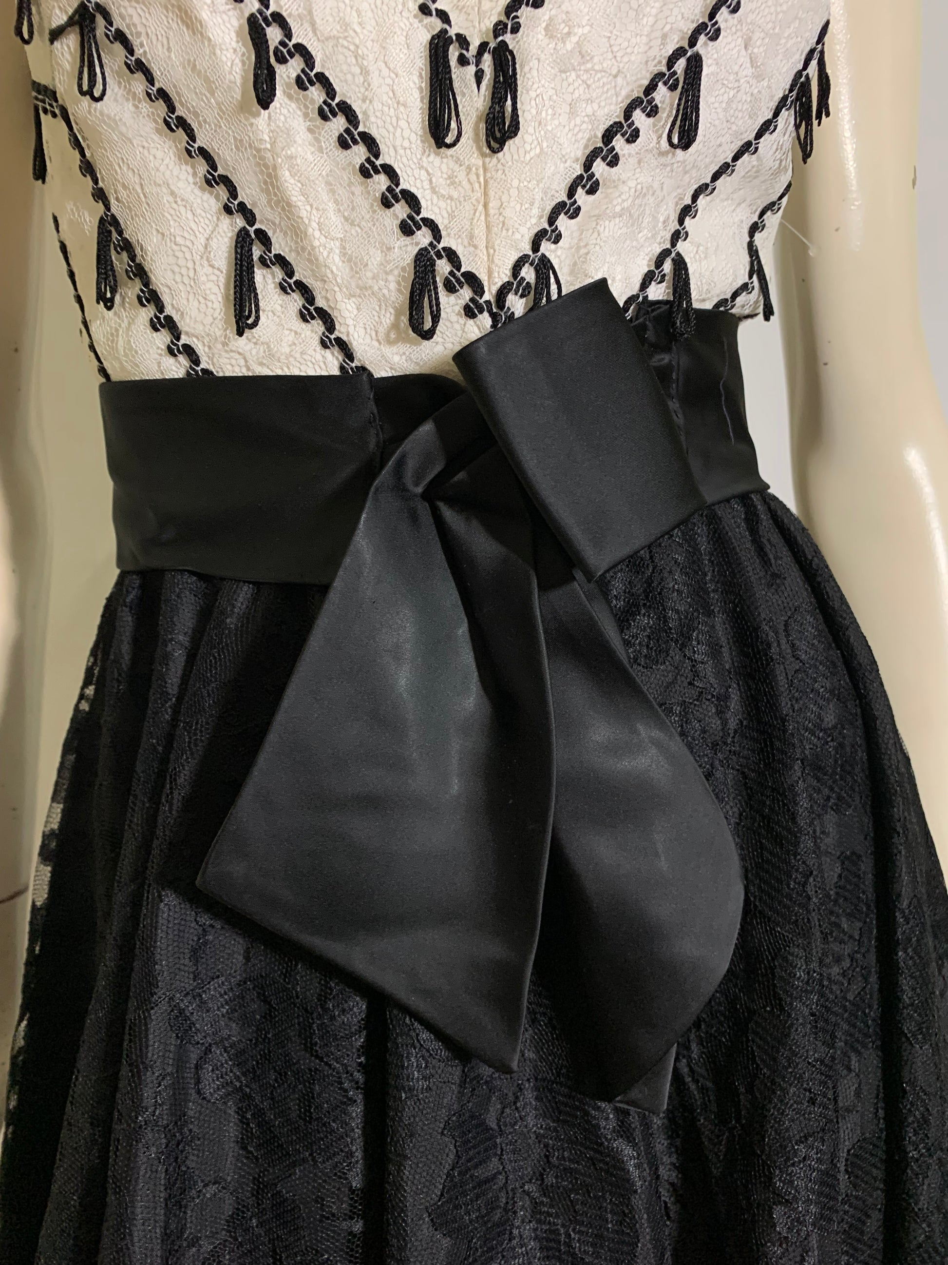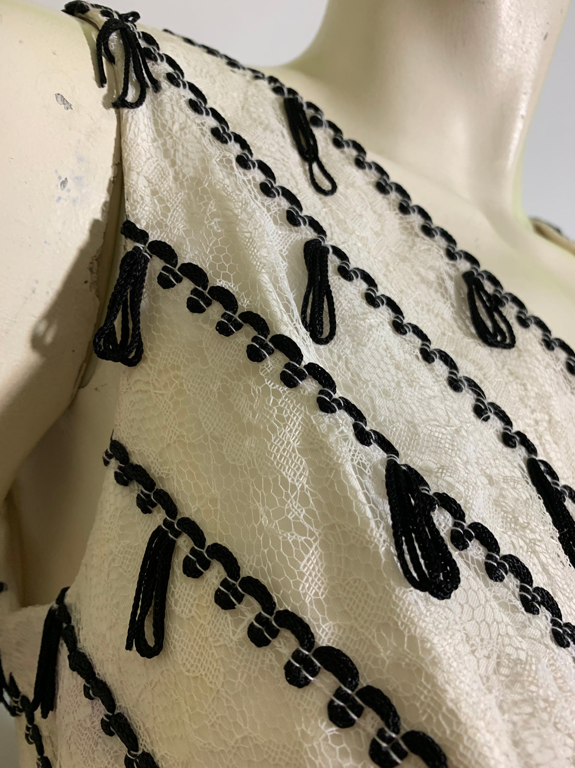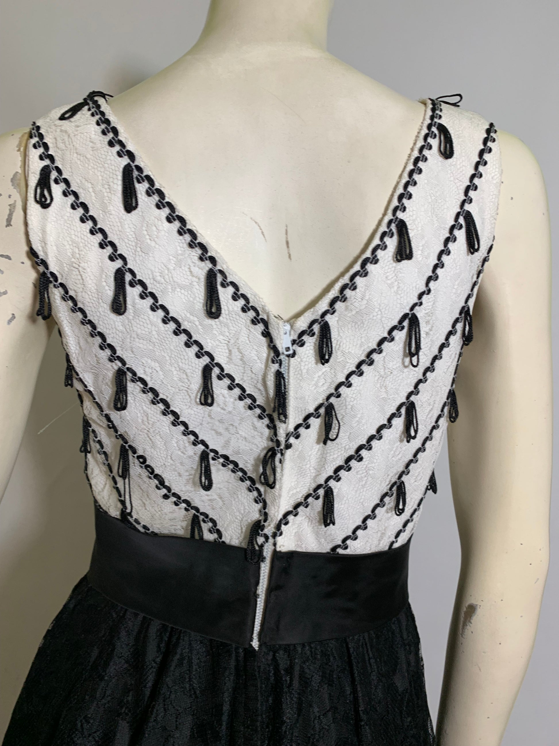Sassy Little Black and White Mini Cocktail Dress with Loop Tassels on Lace Bodice circa 1960s