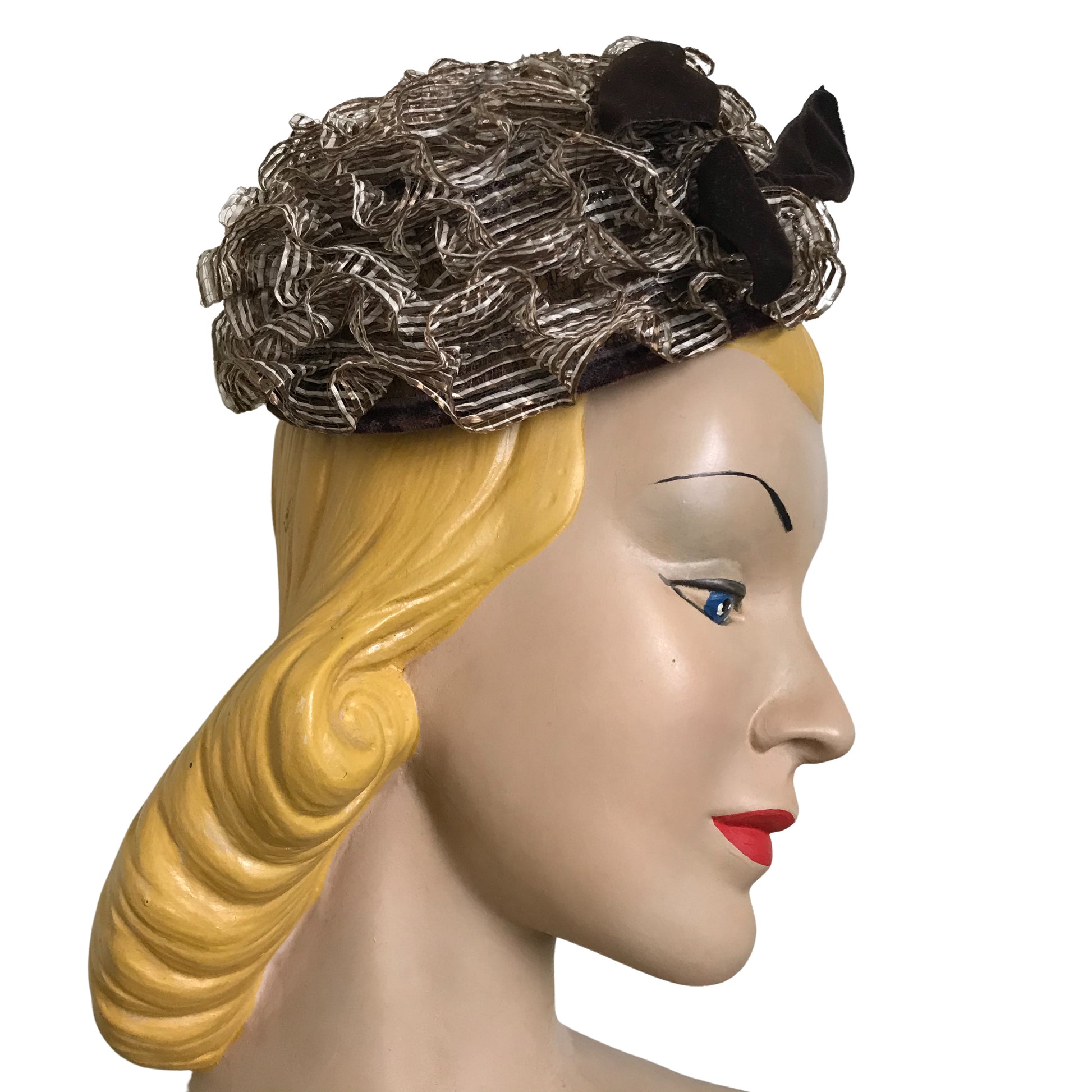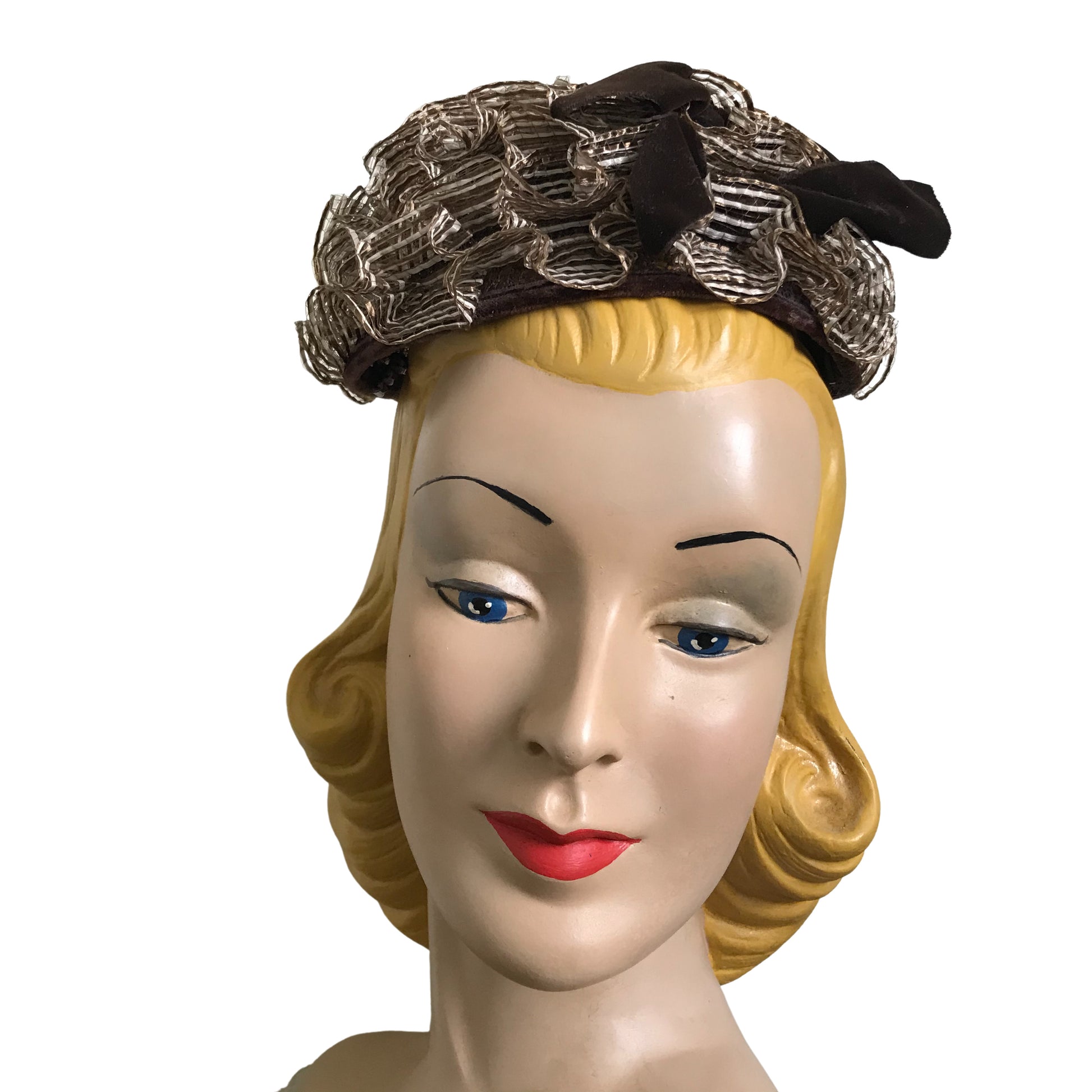 Sculpted Cocoa and White Sisal Whimsy Cap with Velvet Bow circa 1960s Lilly Daché