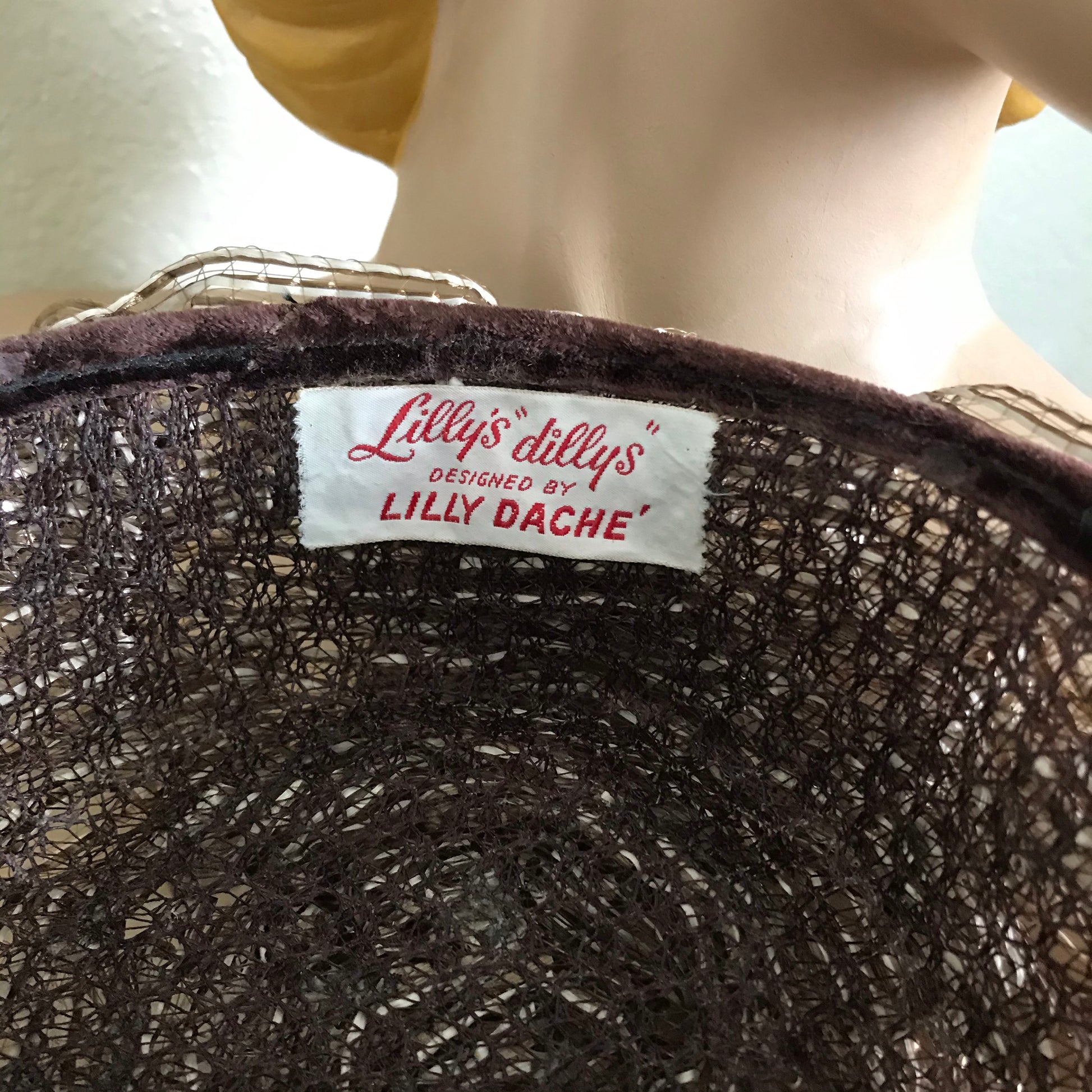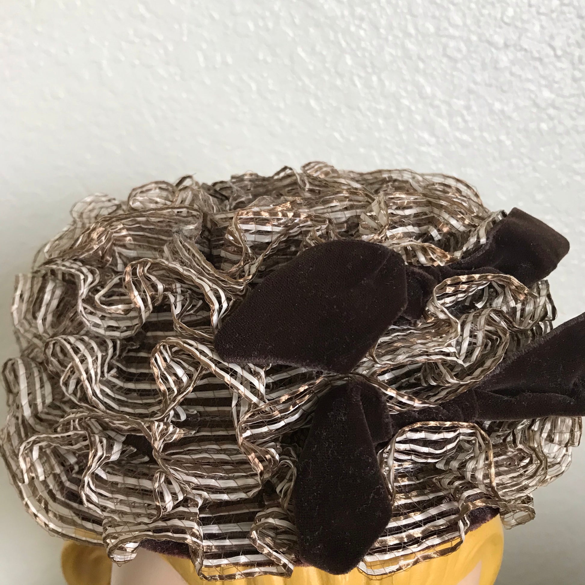 1960s brown and white sculpted sisal whimsy cap by Lilly Daché. Brown velvet bow, combs hold into place. A "Lilly's Dillys", one size, no flaws