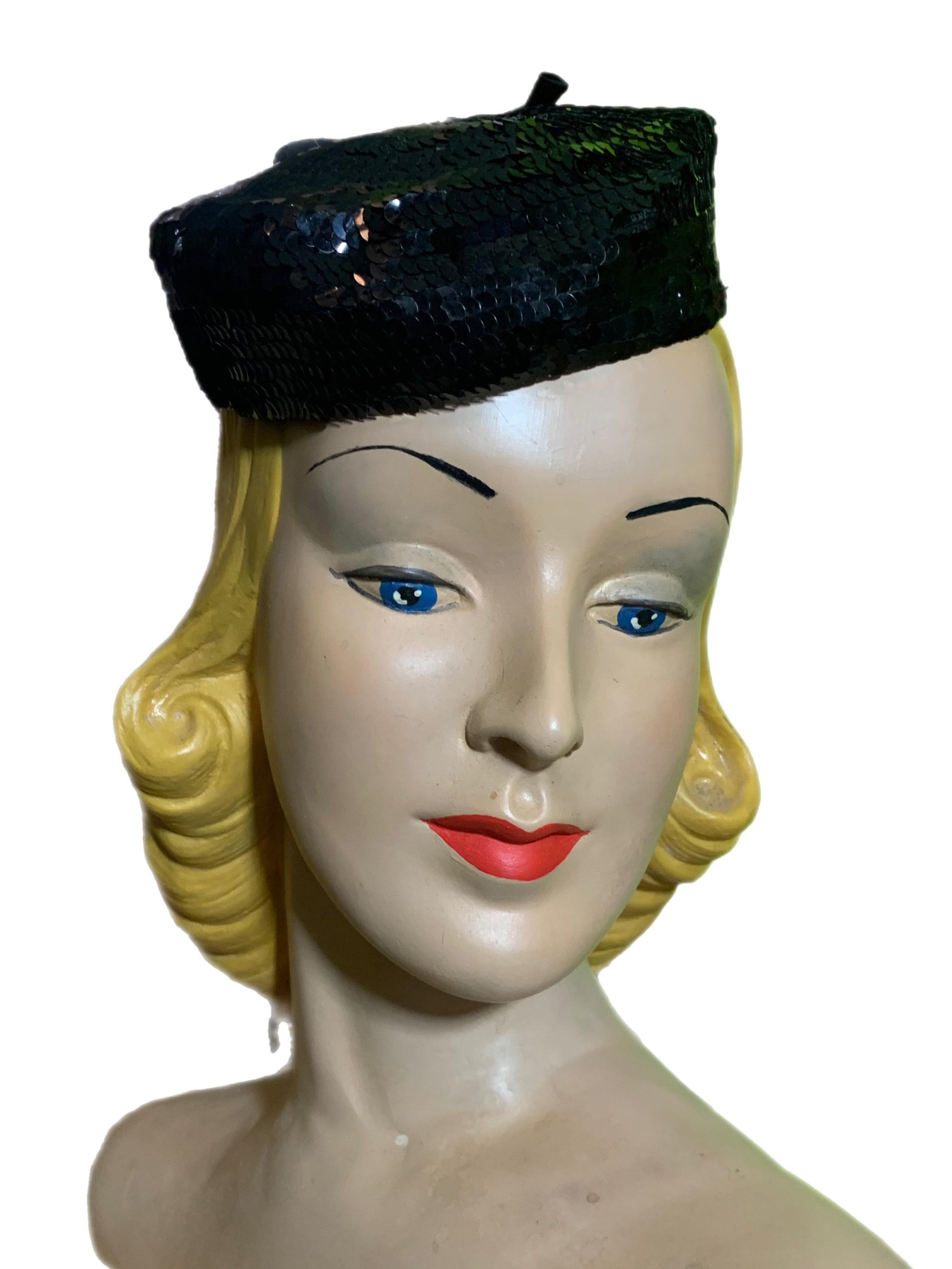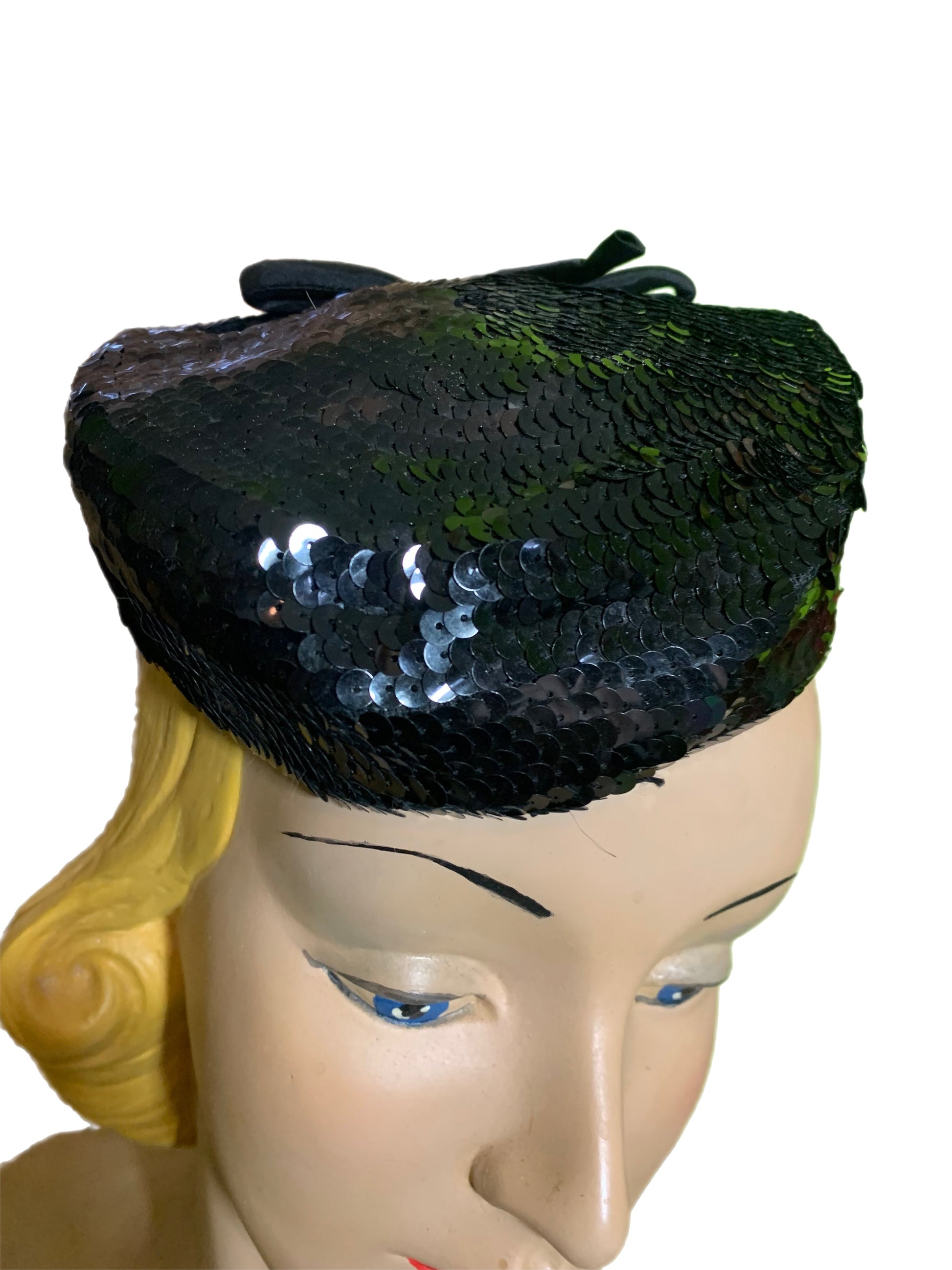 1930s small black faille rayon mini cocktail hat with scads of black iridescent sequins, small bow in back. One size, pins into hair. No label, no flaws.