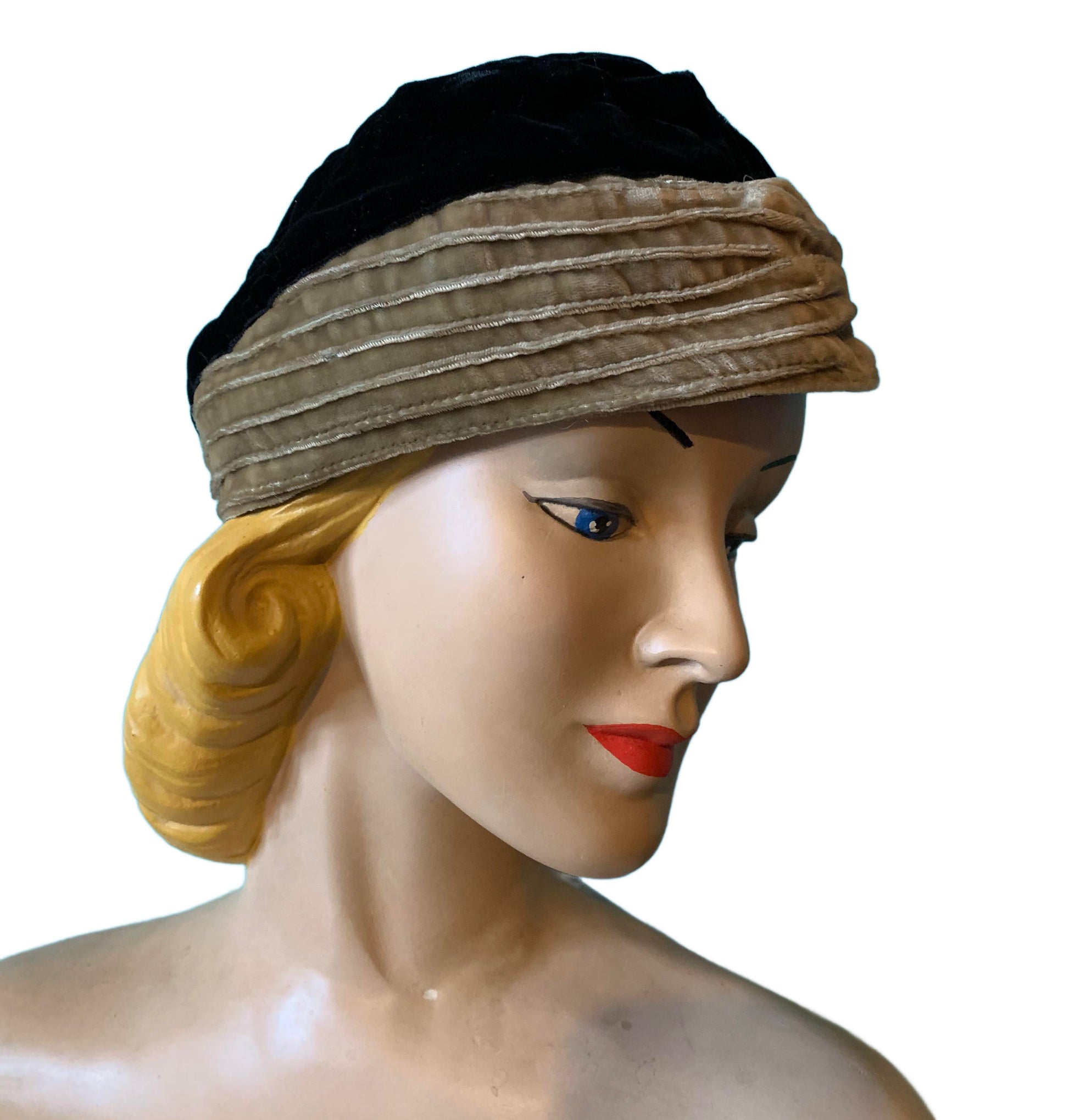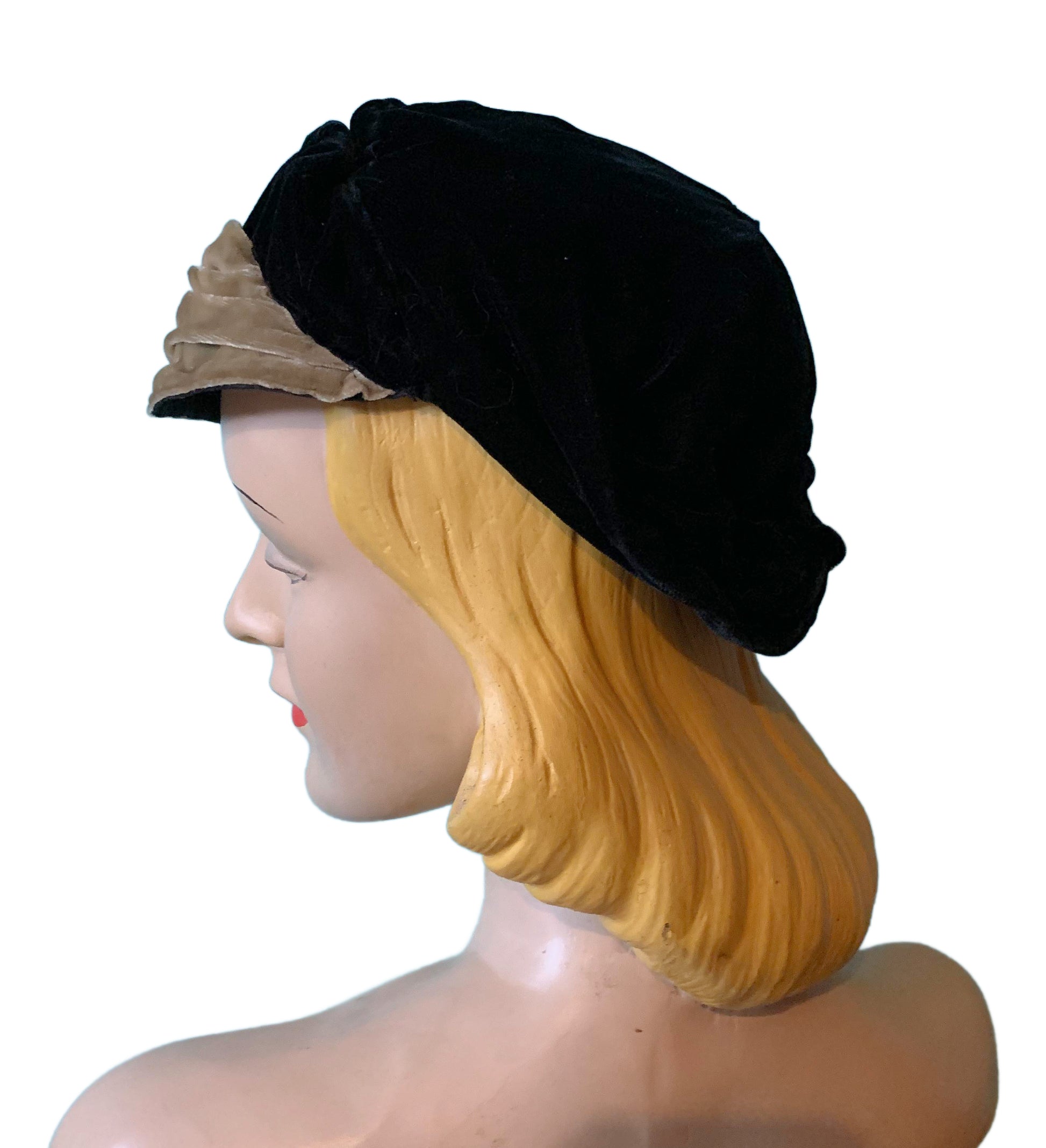 1930s black and golden tan silk velvet close fitting hat with pin tucked front piece. Size S. No label, no flaws.