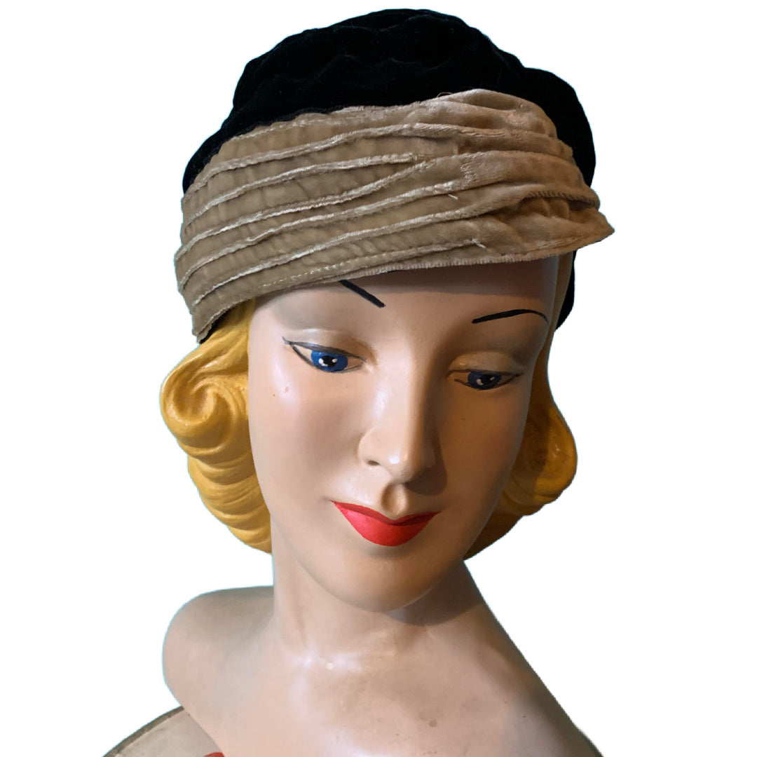 Silk Velvet Black and Golden Tan Close Fit Hat circa 1930s