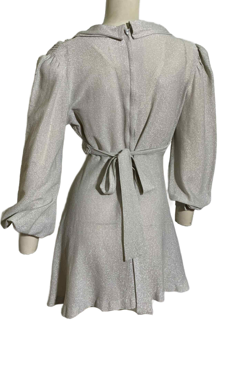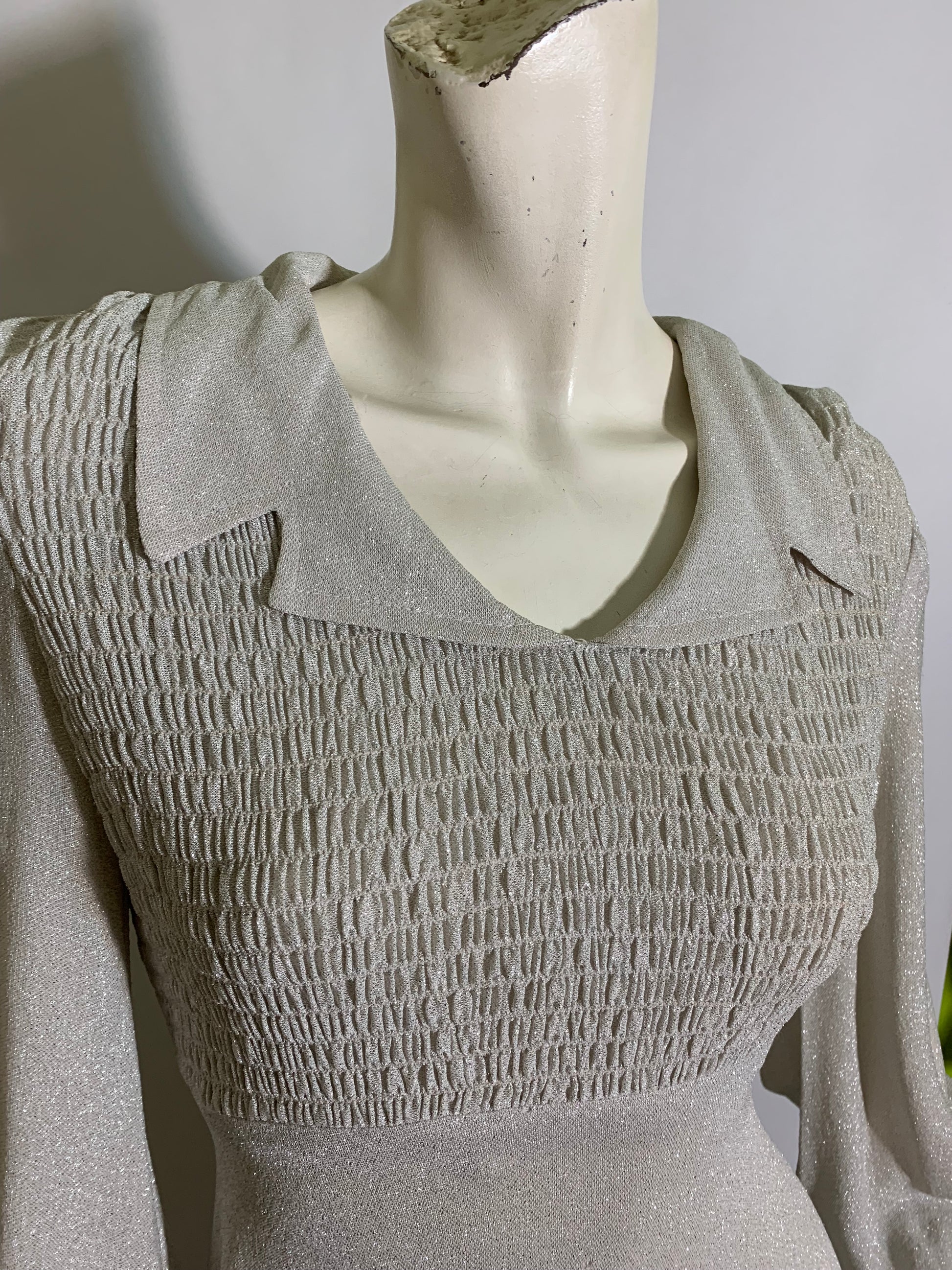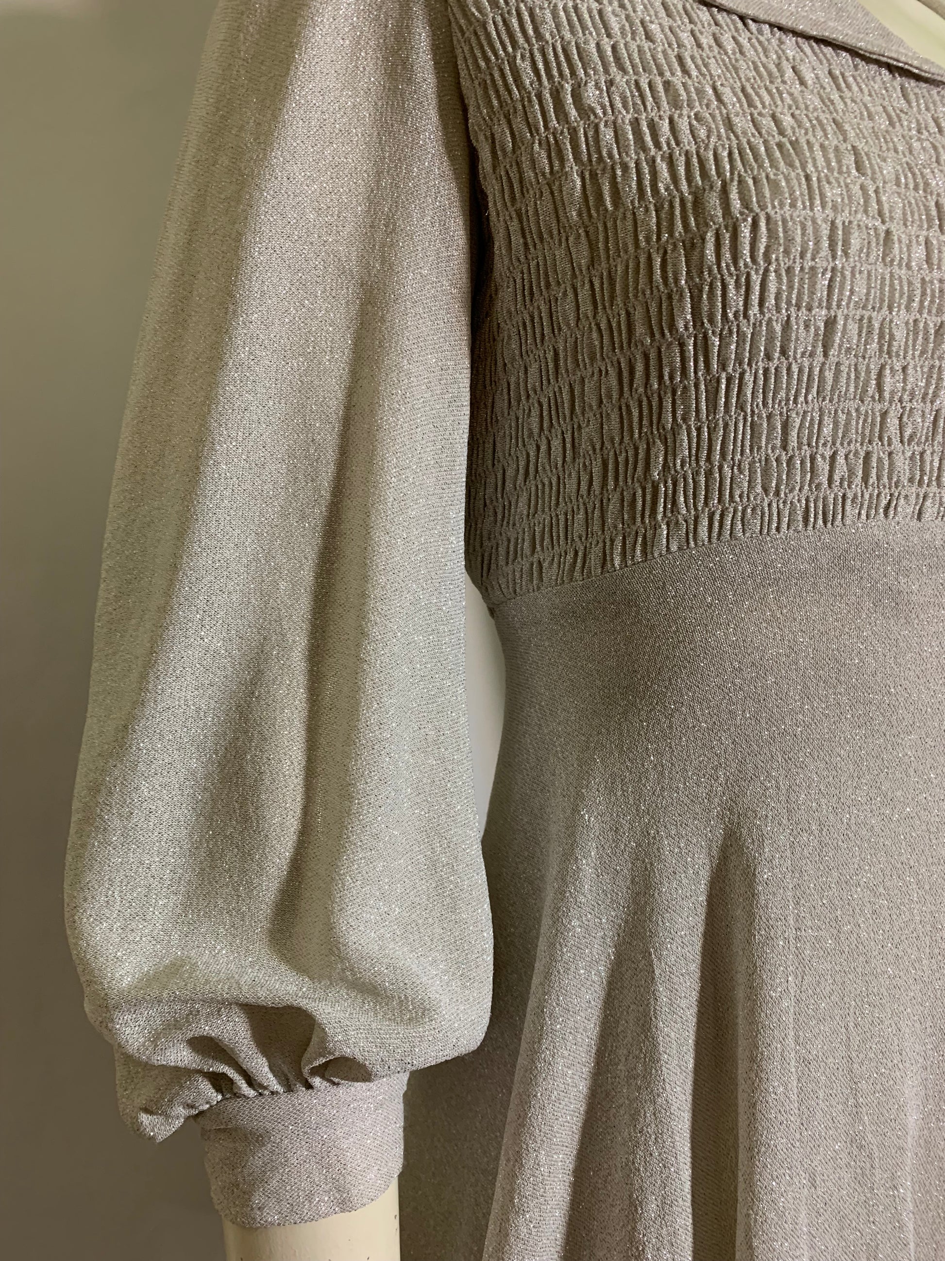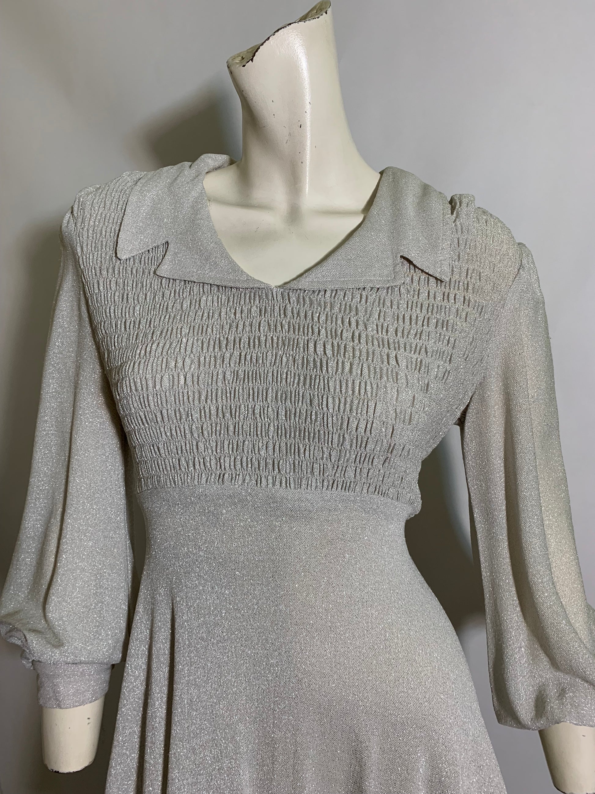 Silver lurex baby doll dress from the 1970s! Smocked upper bodice, ties in back with half ties, full sleeves with rhinestone button cuffs. Unlined. No label. No flaws.