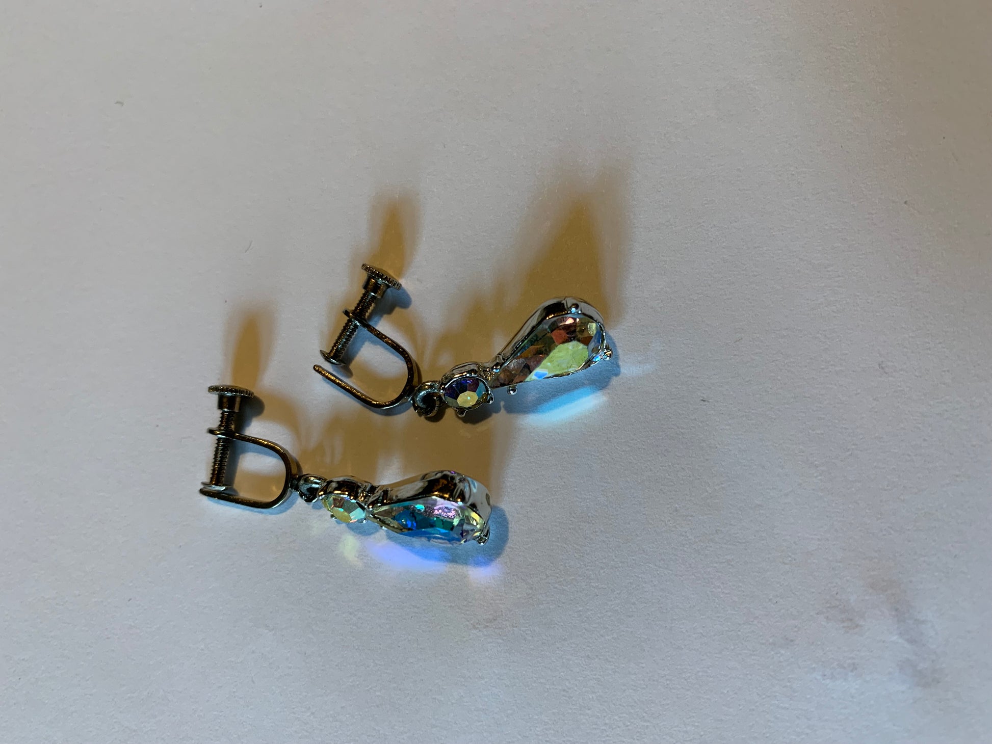 Iridescent Tear Drop Rhinestone Screwback Clip Earrings circa 1940s