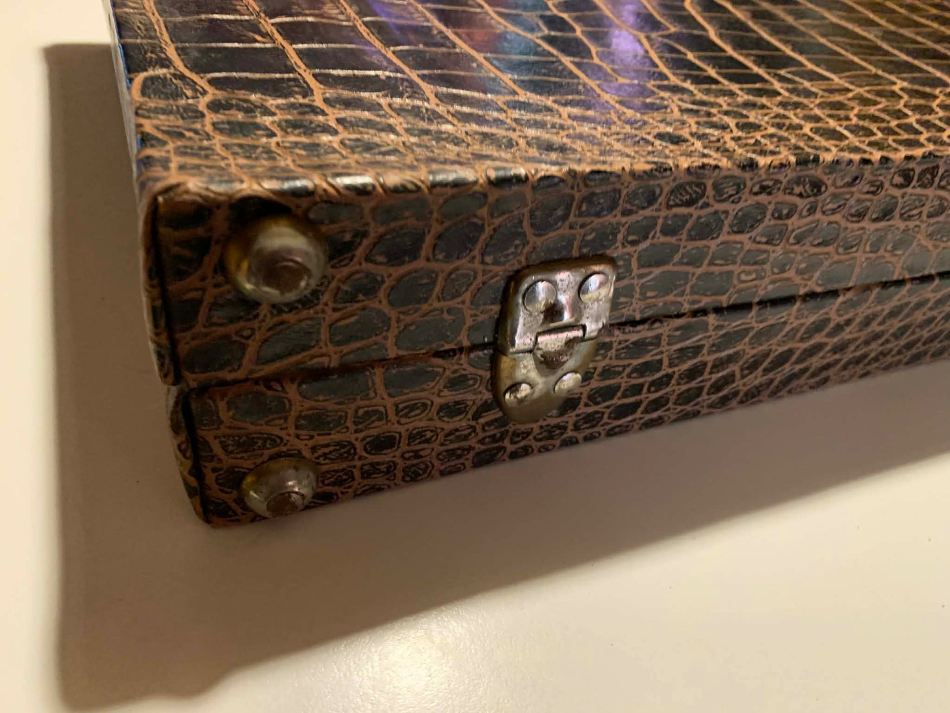 Hard sided 1950s genuine alligator briefcase with vivid red interior, folding clasps, metal feet. No markings, no flaws.