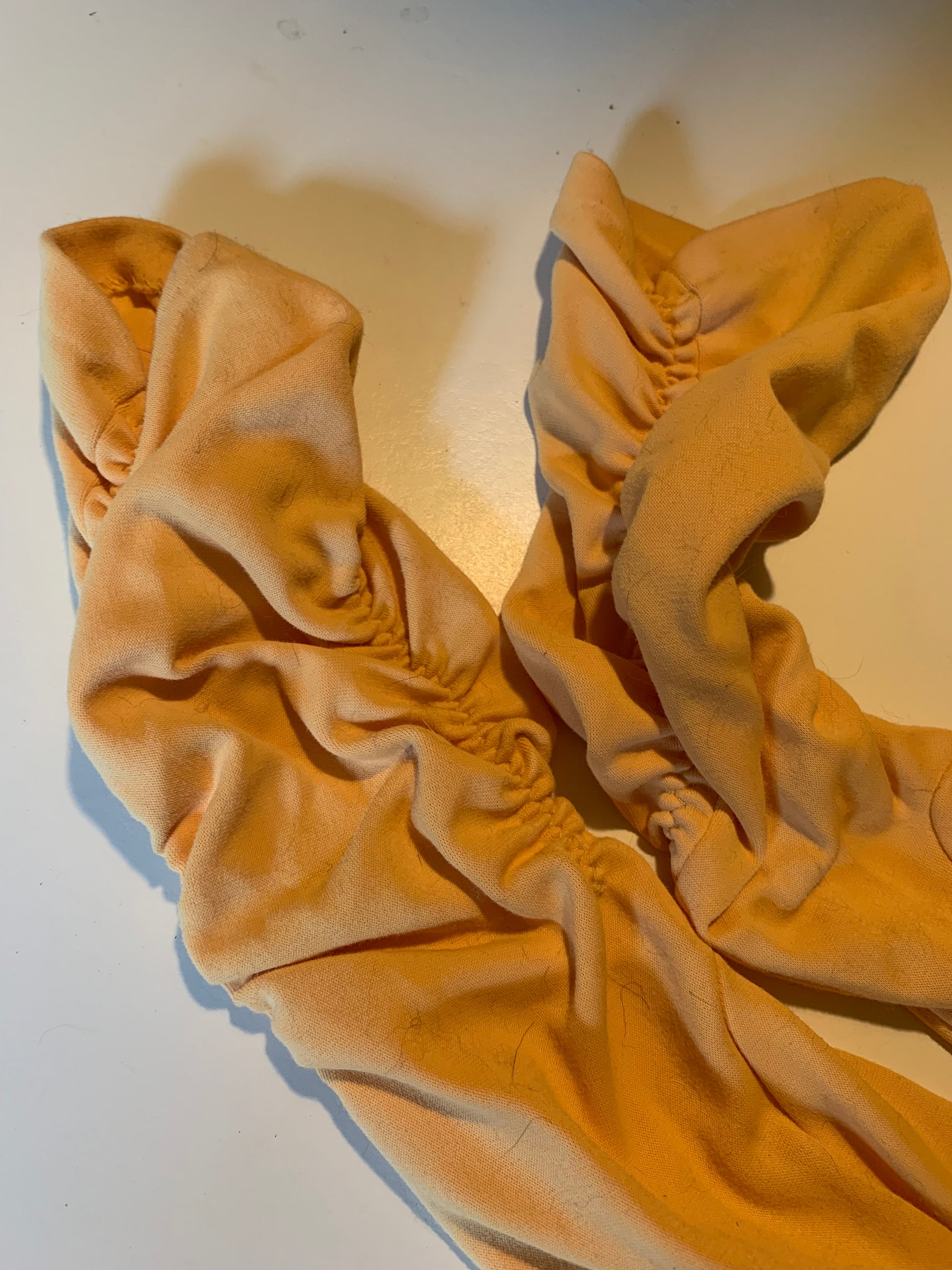 Melon colored nylon 1960s gloves, mid forearm length, ruched sides. No label. Best fit S/M. 15" long, size 7.