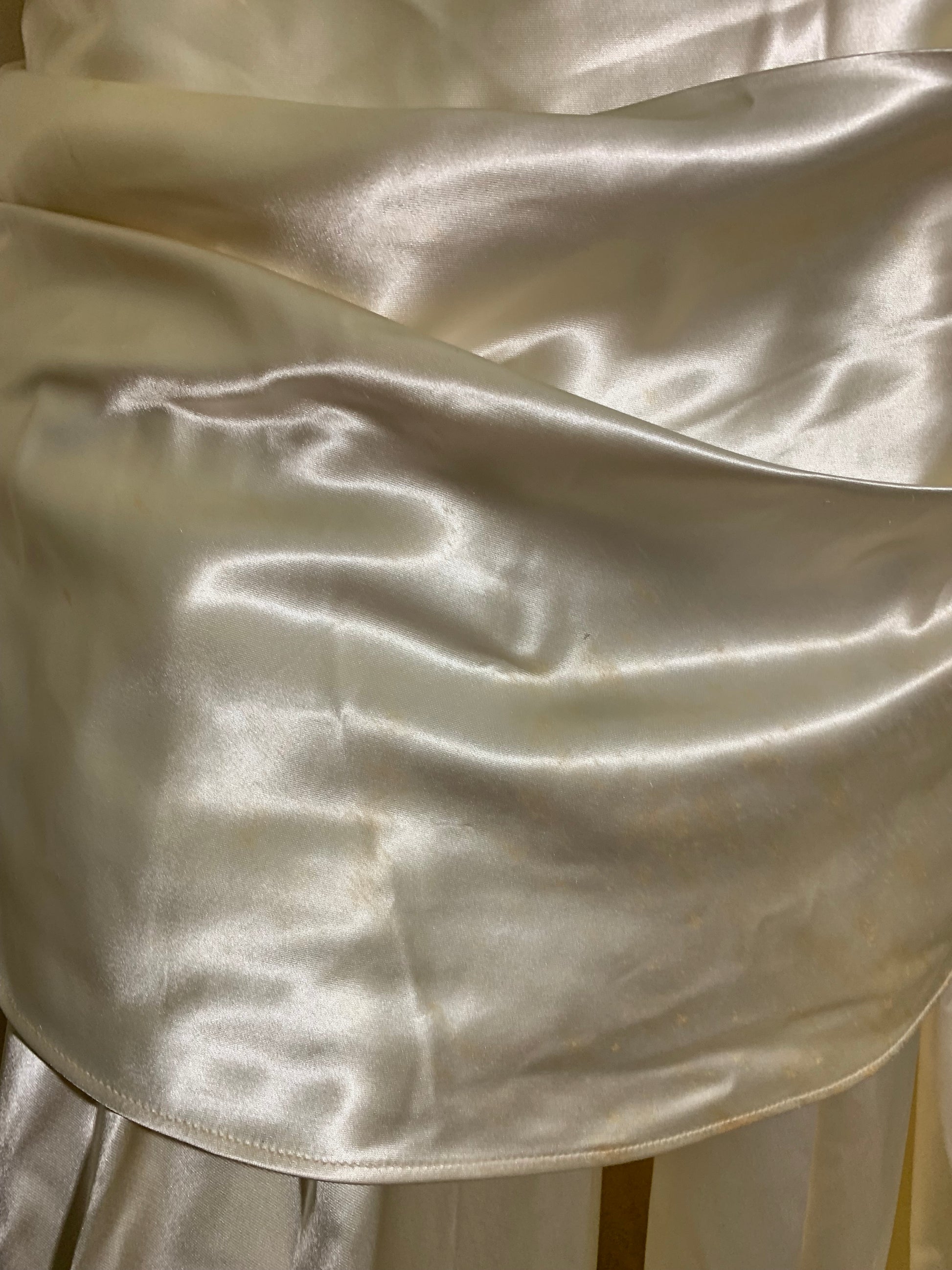 Soft white slipper satin 1940s wedding dress with draped hips, folded neckline with lace accents- mesh above folded part. Long sleeves with bridal buttons and peaks. Loads of bridal buttons up back- 2 missing satin tops. Spots on skirt and hip accent as shown, frayed at top of right shoulder- selling as is.