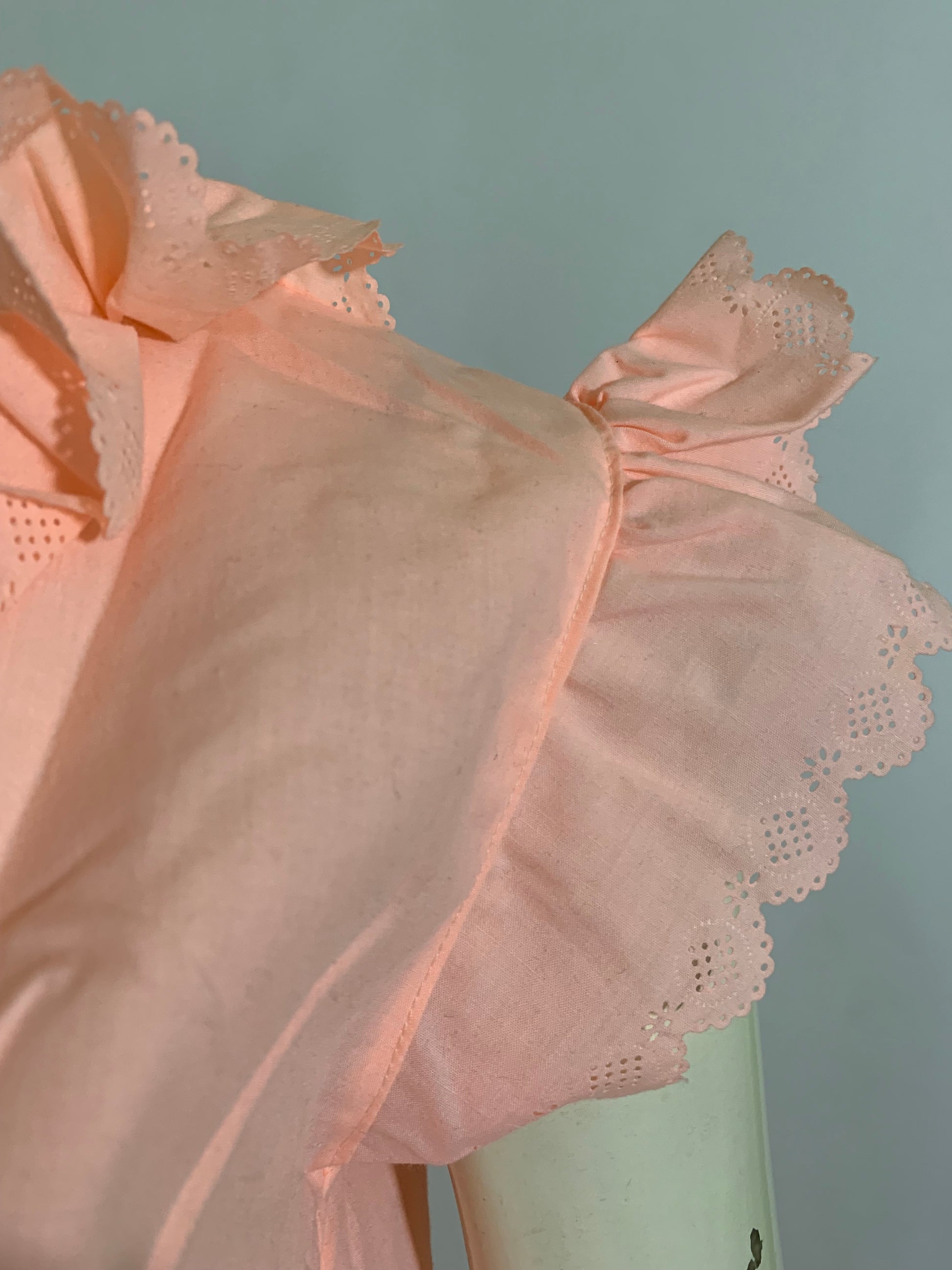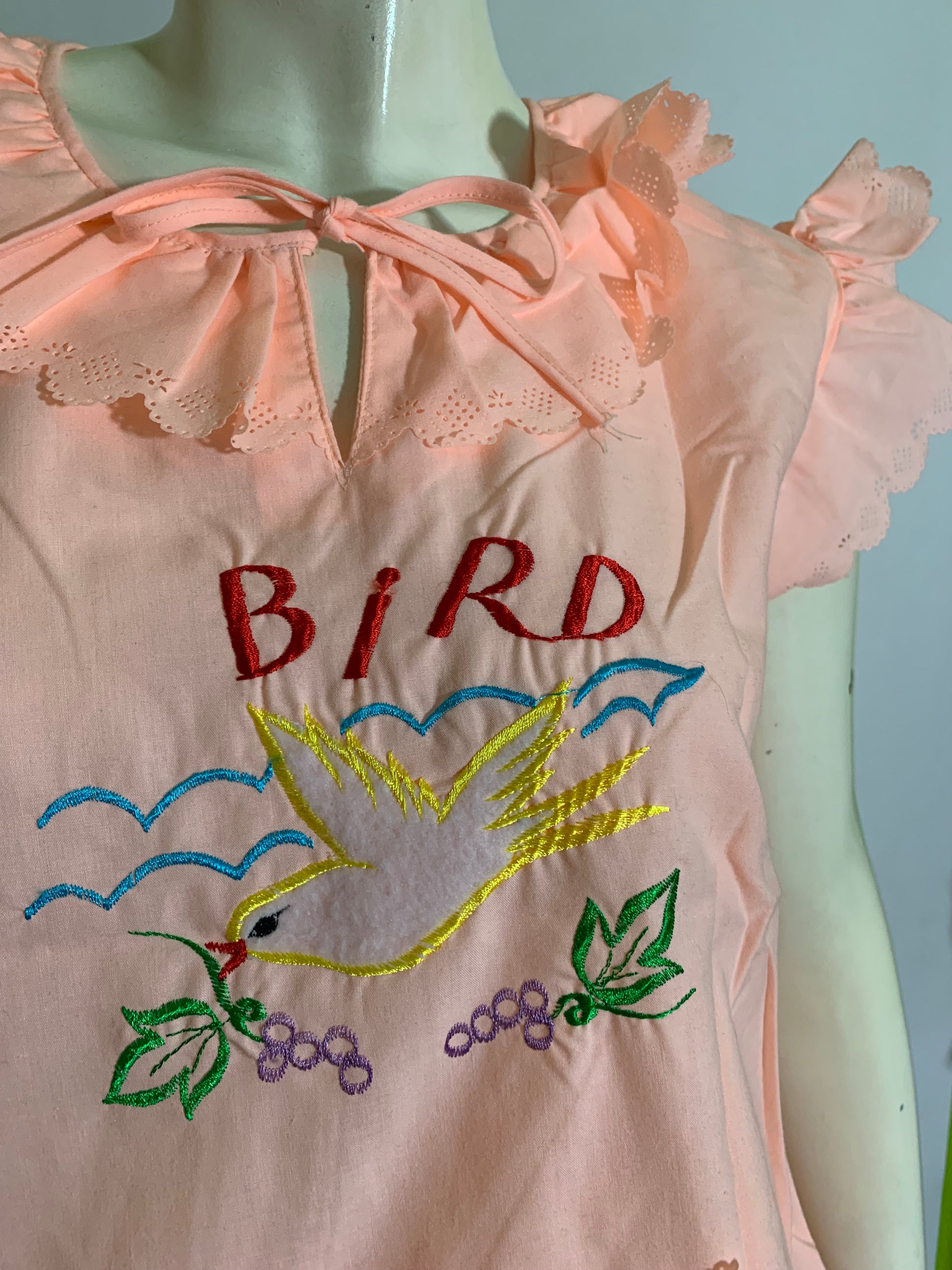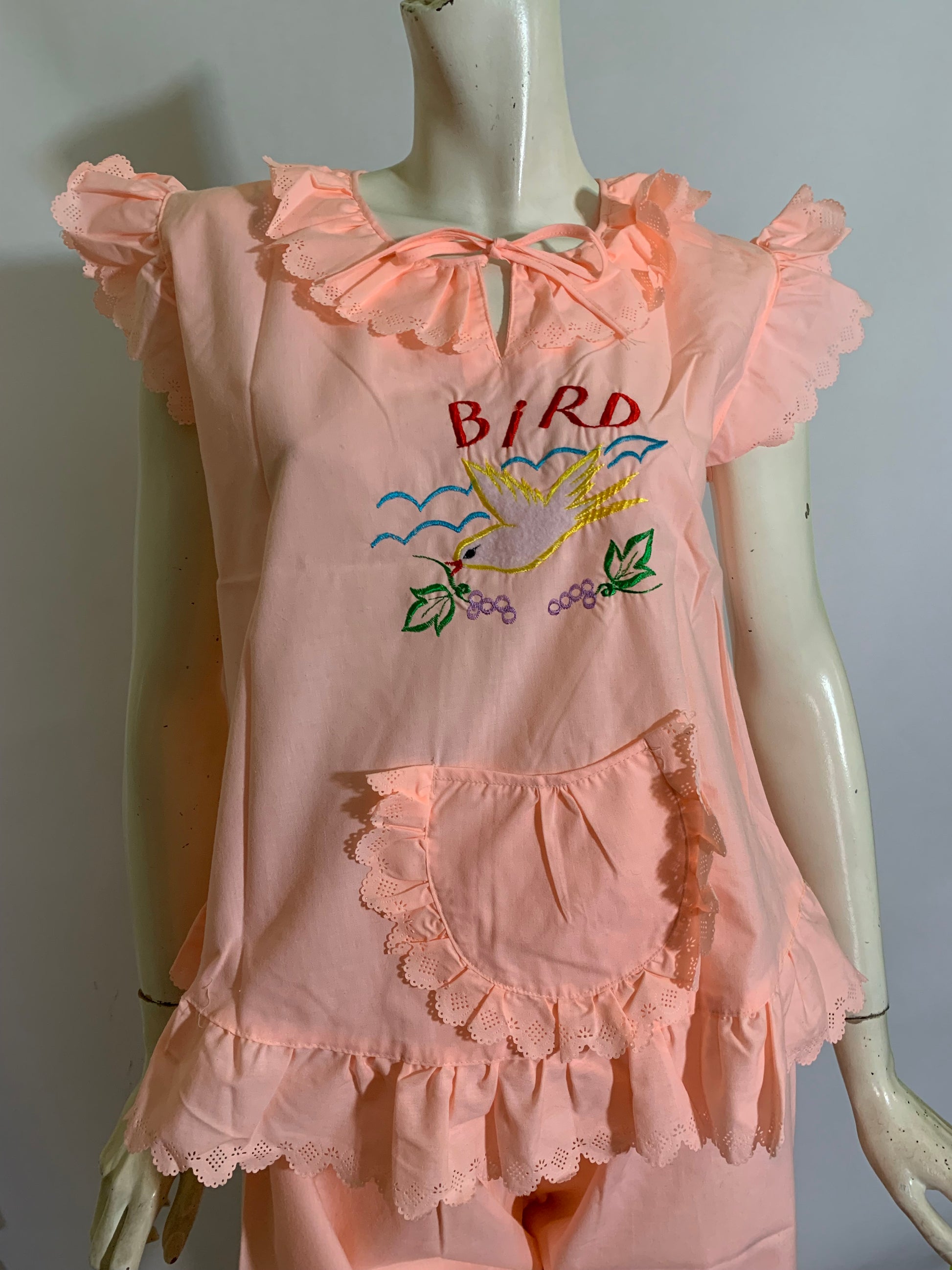Brand new old stock peach cotton 1930s inspired pajama set with embroidered "BIRD" and bird design. Bird body is done in an interfacing white texture. Bow at neck, ruffled shoulders, elastic waist on knee length pants. No flaws. Really not sure of dating, definitely not 1930s though they very much look like it!