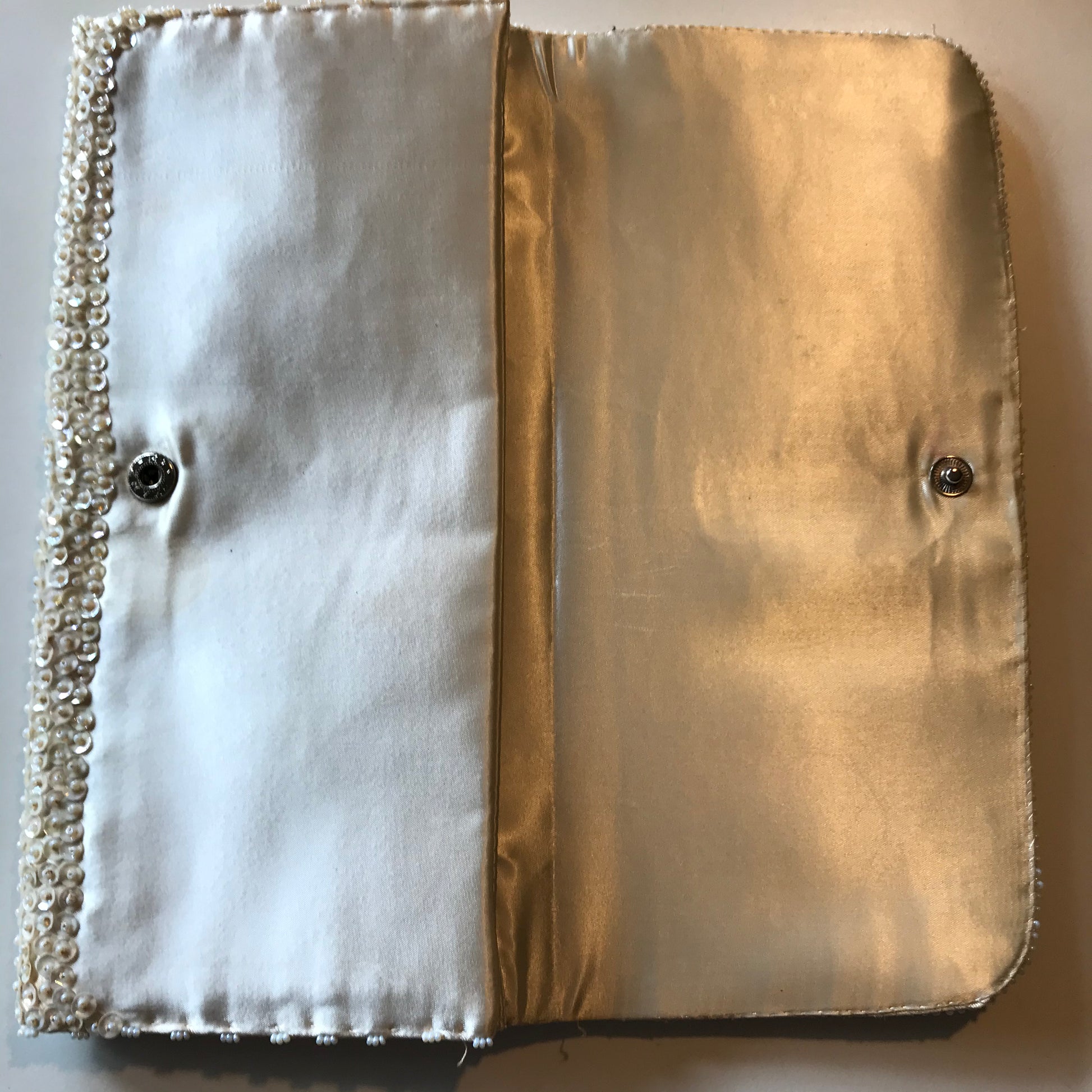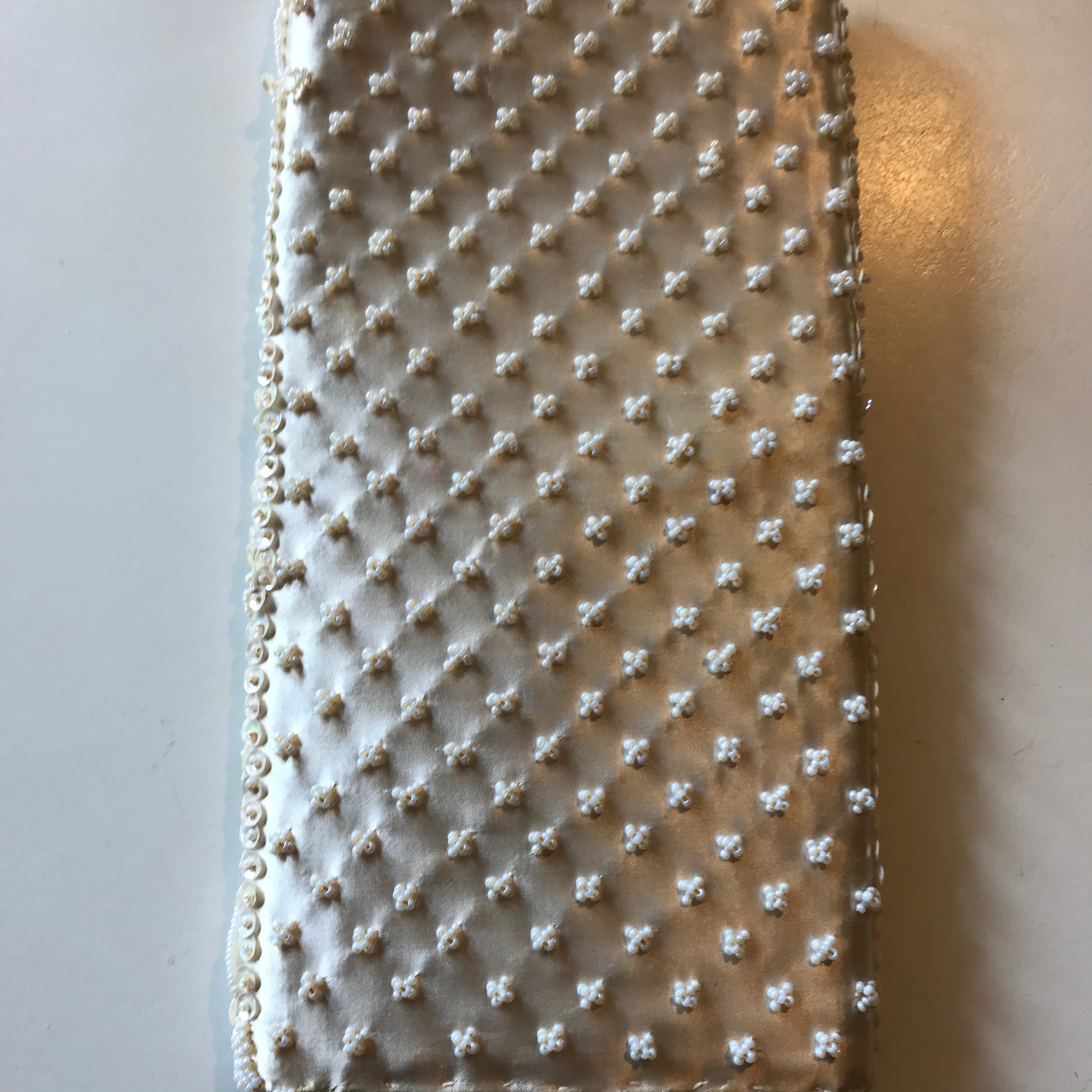 1960s off-white satin beaded envelope style evening bag, made in Hong Kong. No flaws.