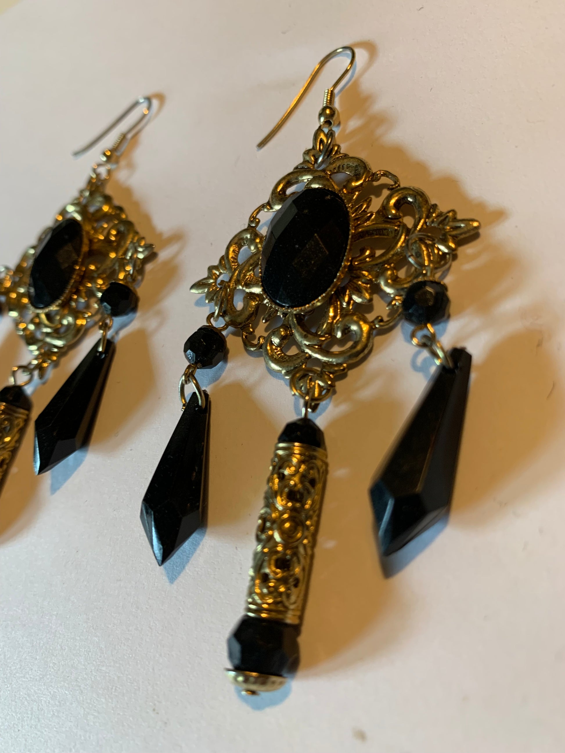 Statement Sized Black and Gold Chandelier Earrings circa 1980s