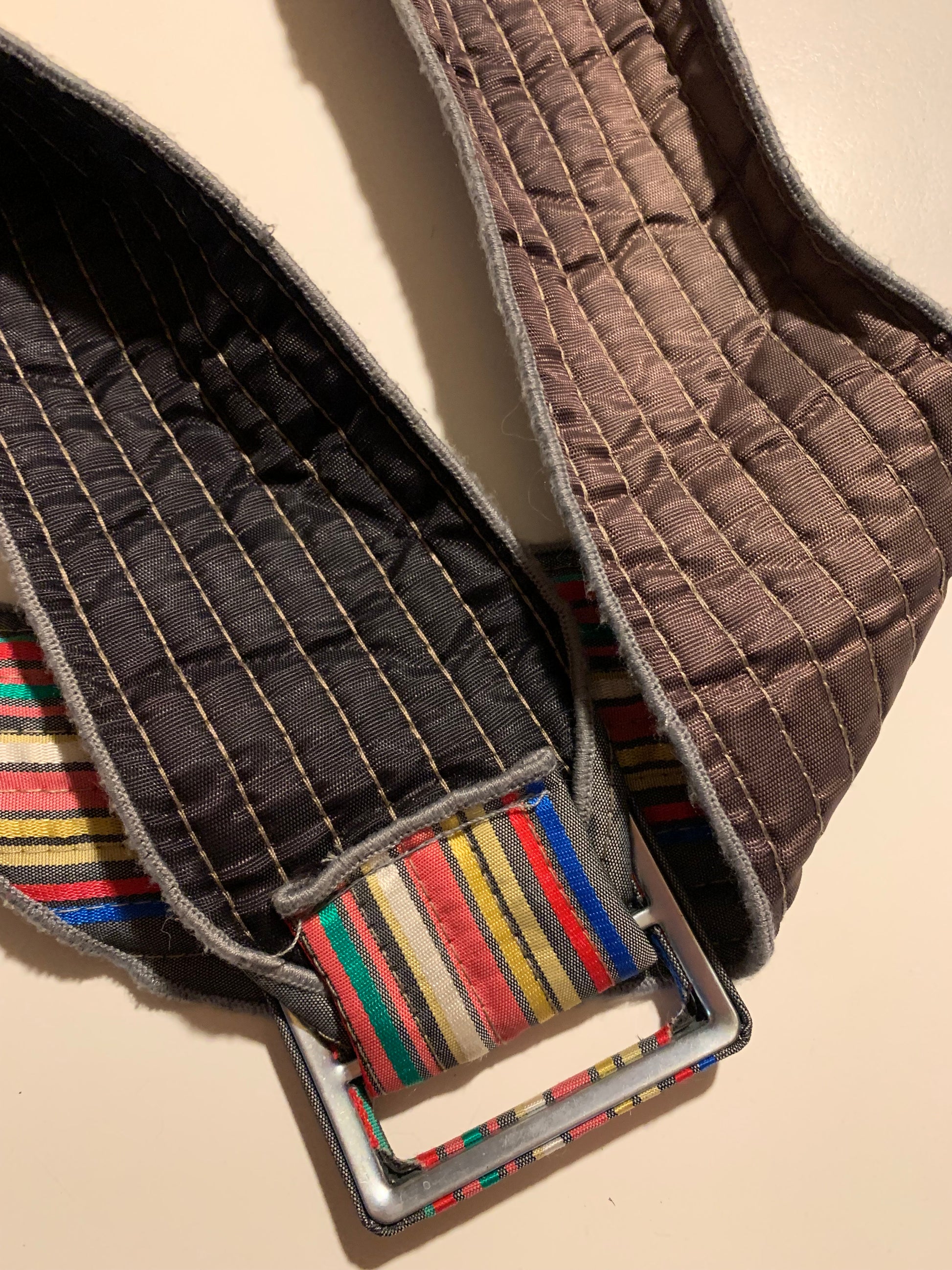 Candy striped faille rayon wide fabric belt, quilted/channel stitched. One side. No label, no flaws.