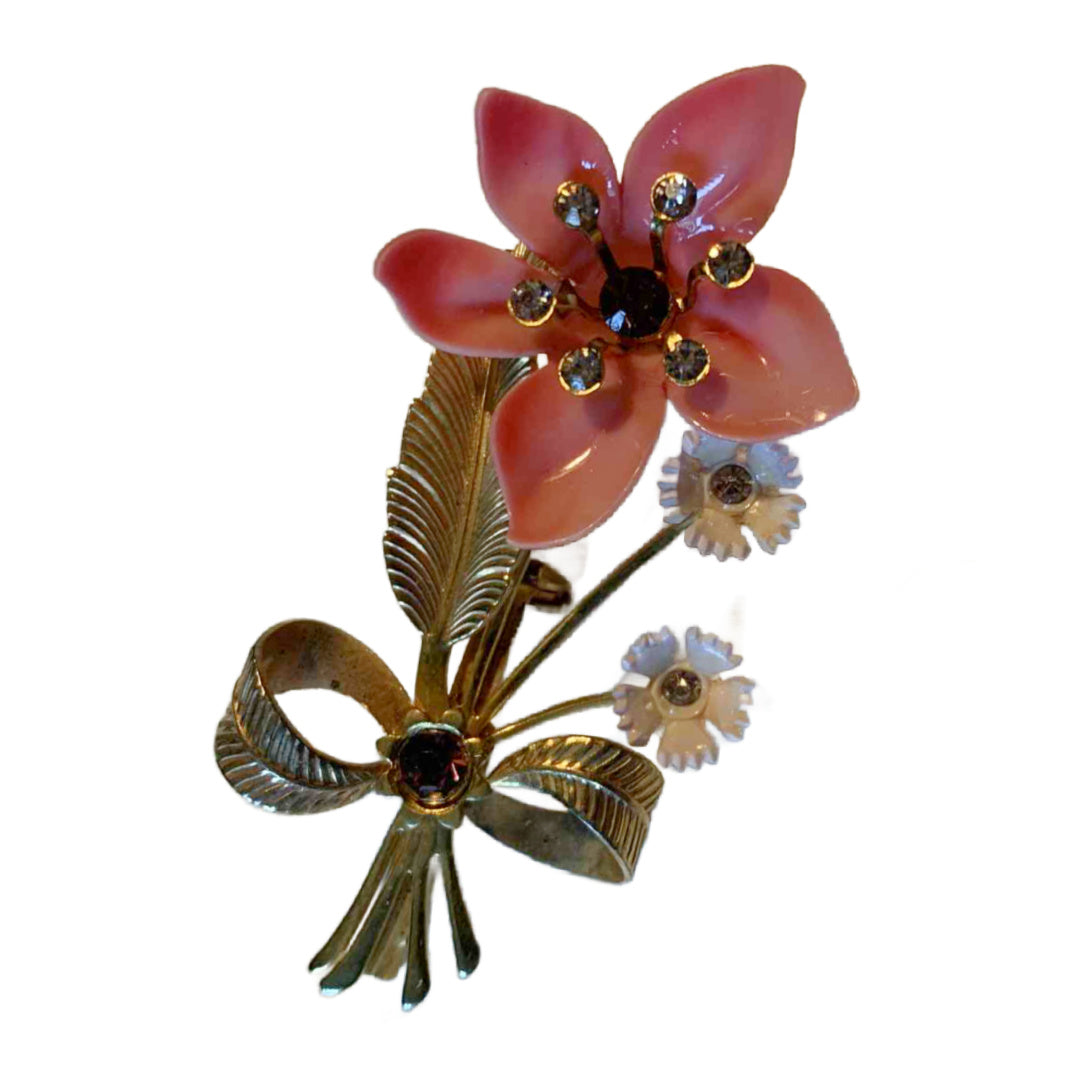Pink enameled gold tone metal late 40s to 50s bouquet brooch with rhinestones. 2 1/2", no markings, no flaws.