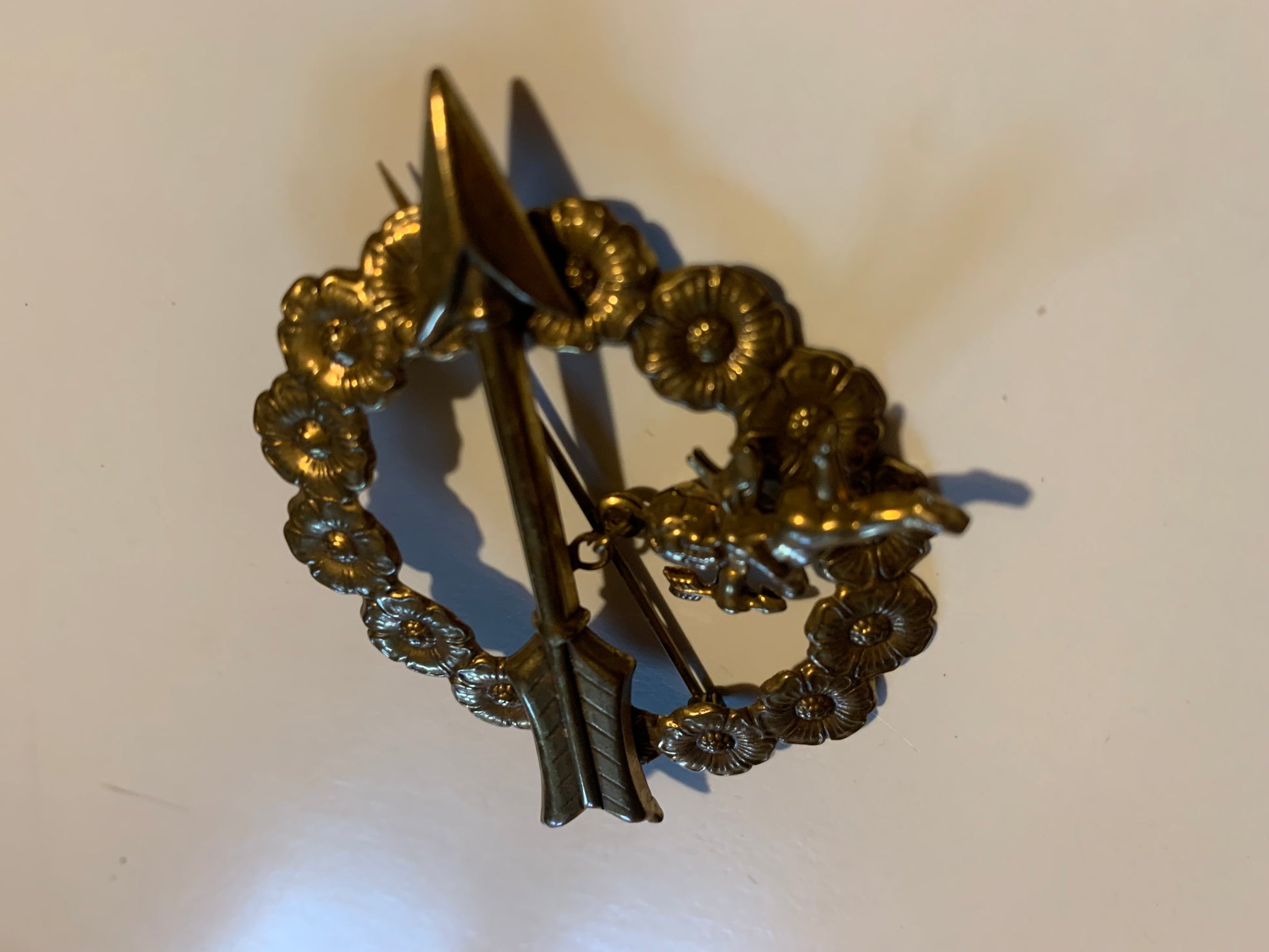 Die struck light weight gold tone metal WWII sweetheart brooch- an oval wreath of flowers and arrow with dangling cherub charm. Spin barrel clasp. 2 1/2" wide, no markings, no flaws.