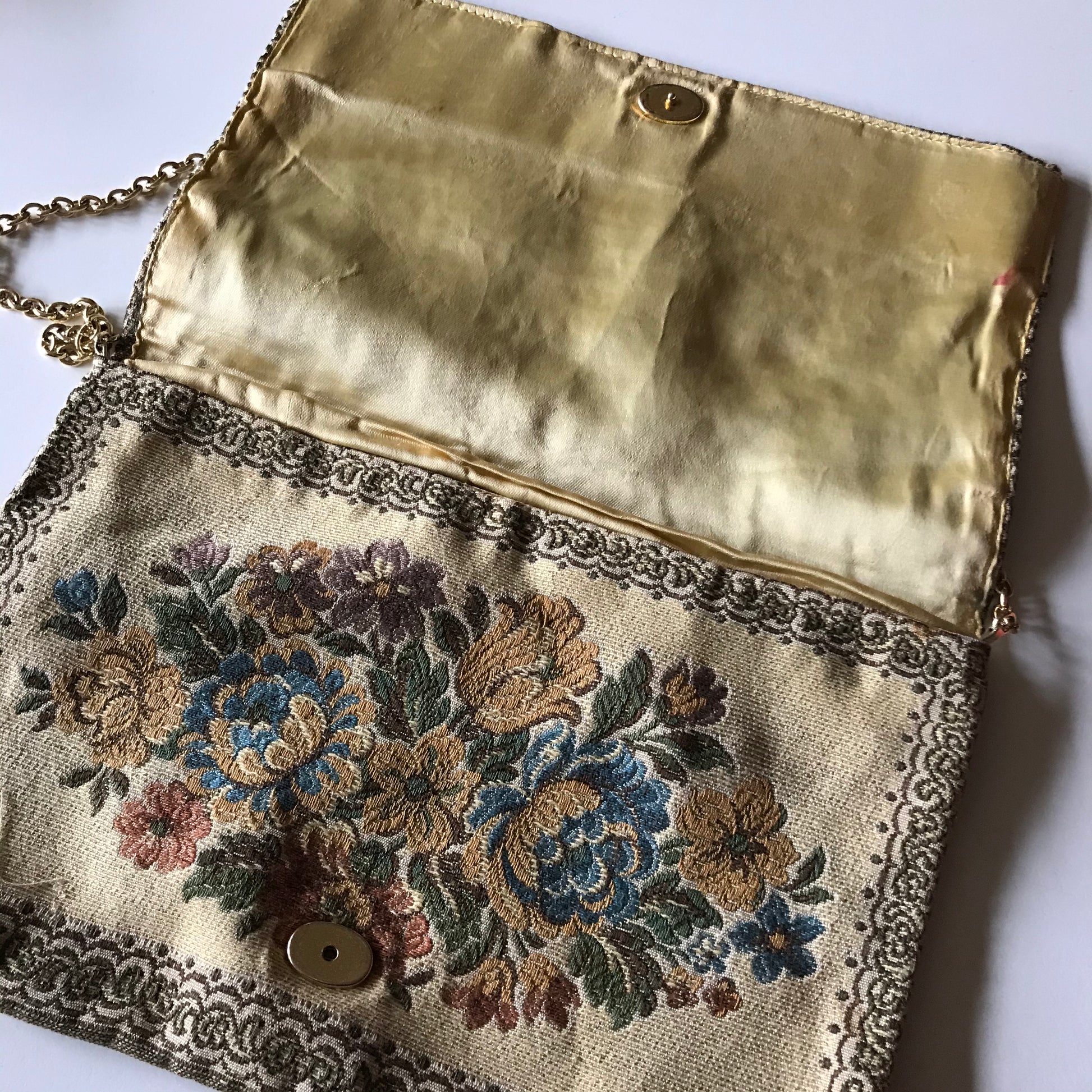 Tapestry Fabric Handbag with Metallic Threads, Gold Tone Clasp and Chain Strap circa 1970s