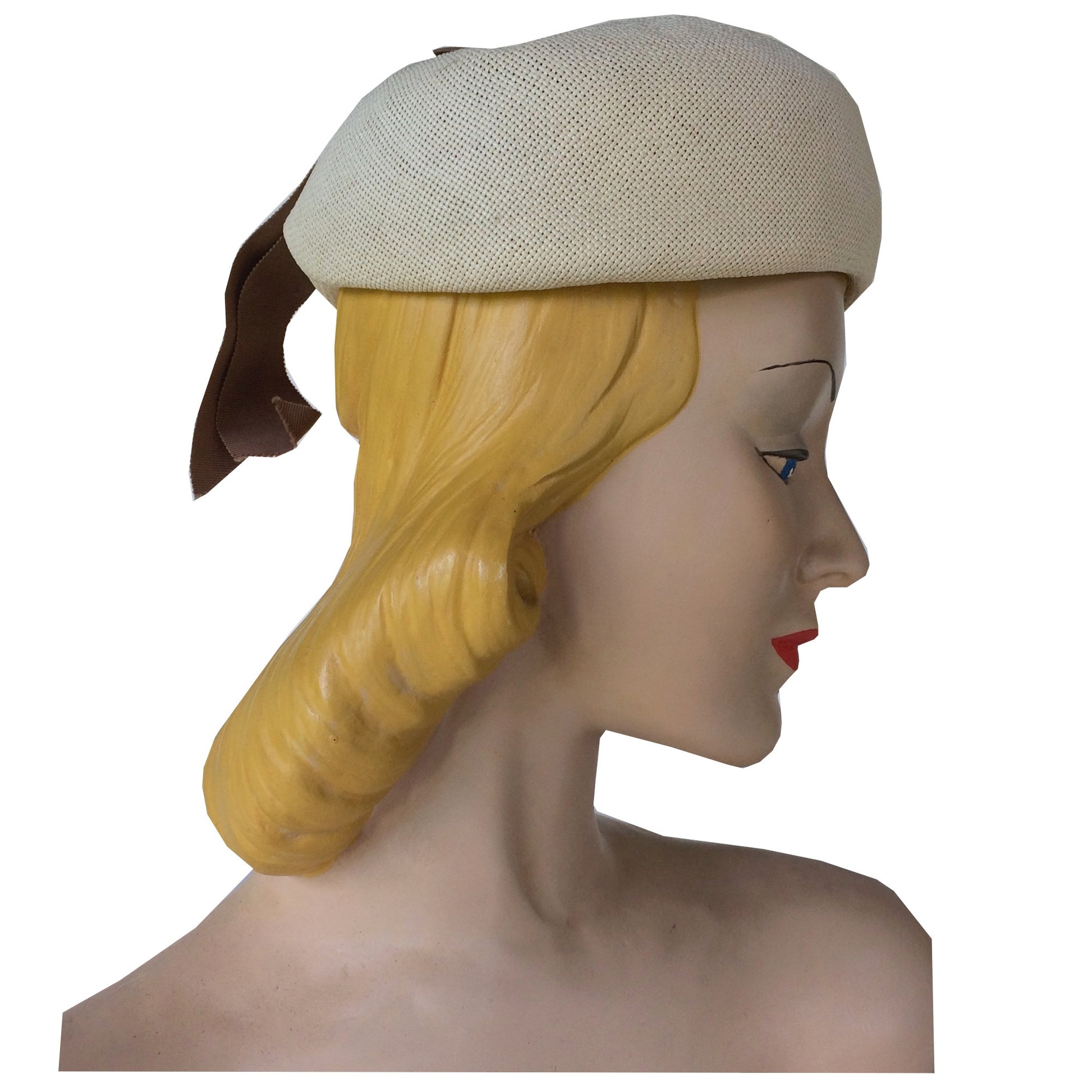 1960s lightweight, tightly woven straw bubble hat w/ brown button and ribbon. No holes or stains, size 21 1/2.