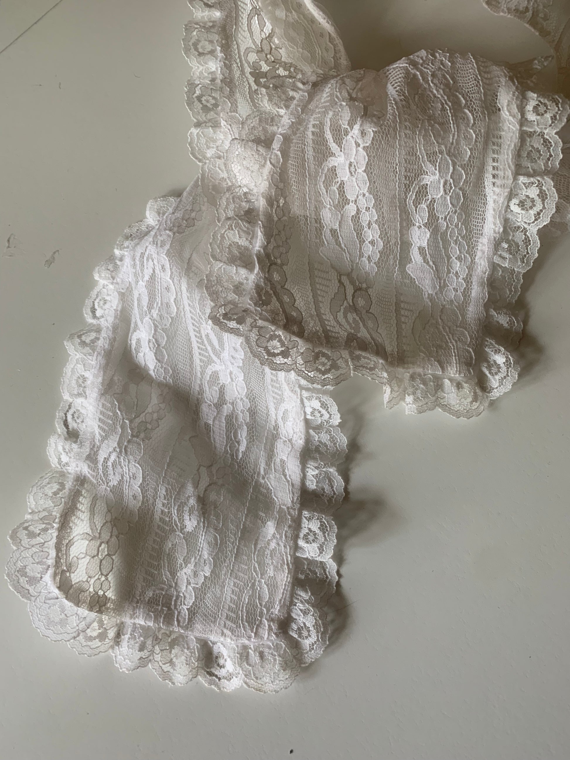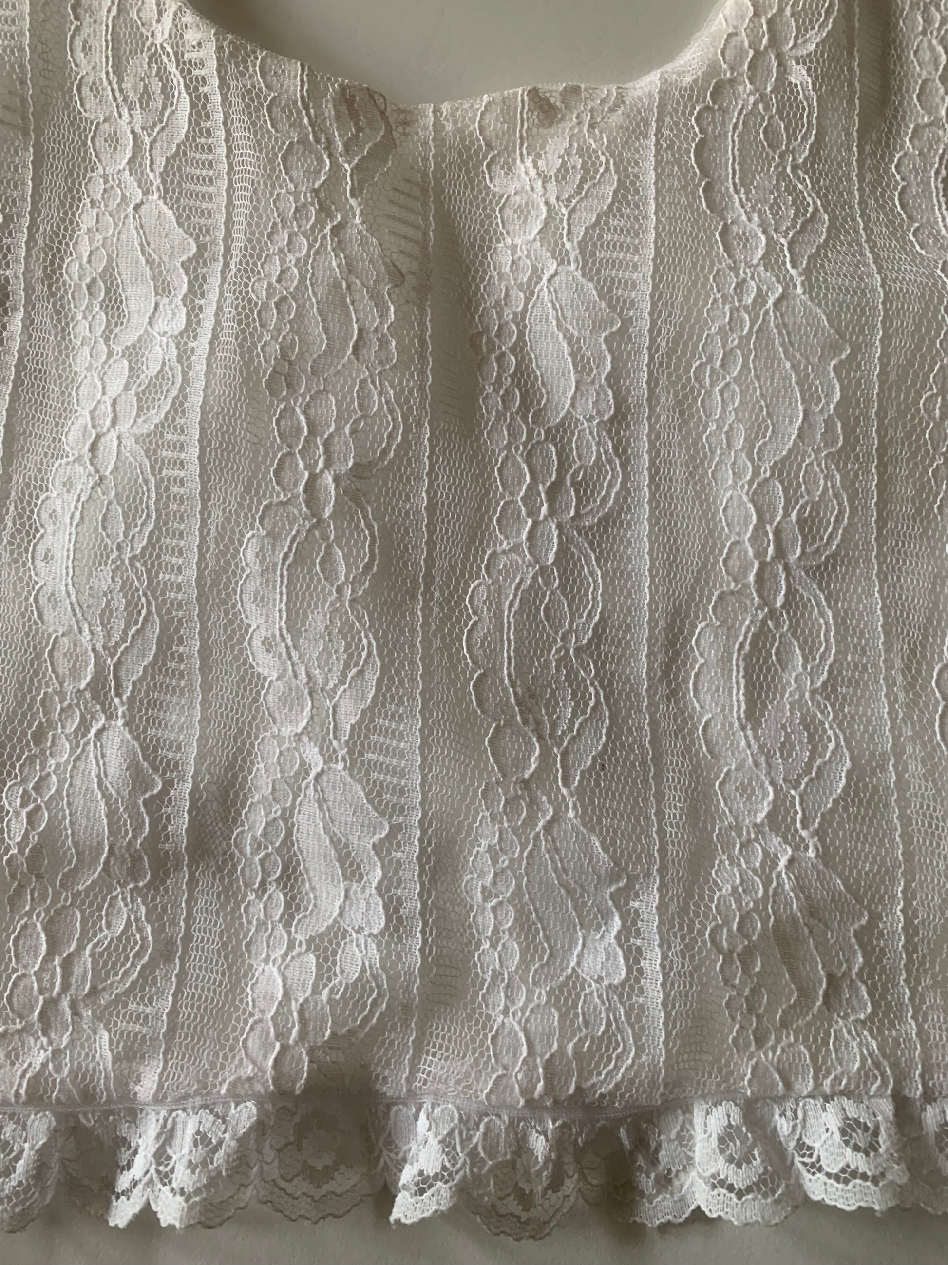 28" long, 8" long back bib, 15" wide- white acrylic 1960s sailor collar to tie in front (or back!) No flaws.