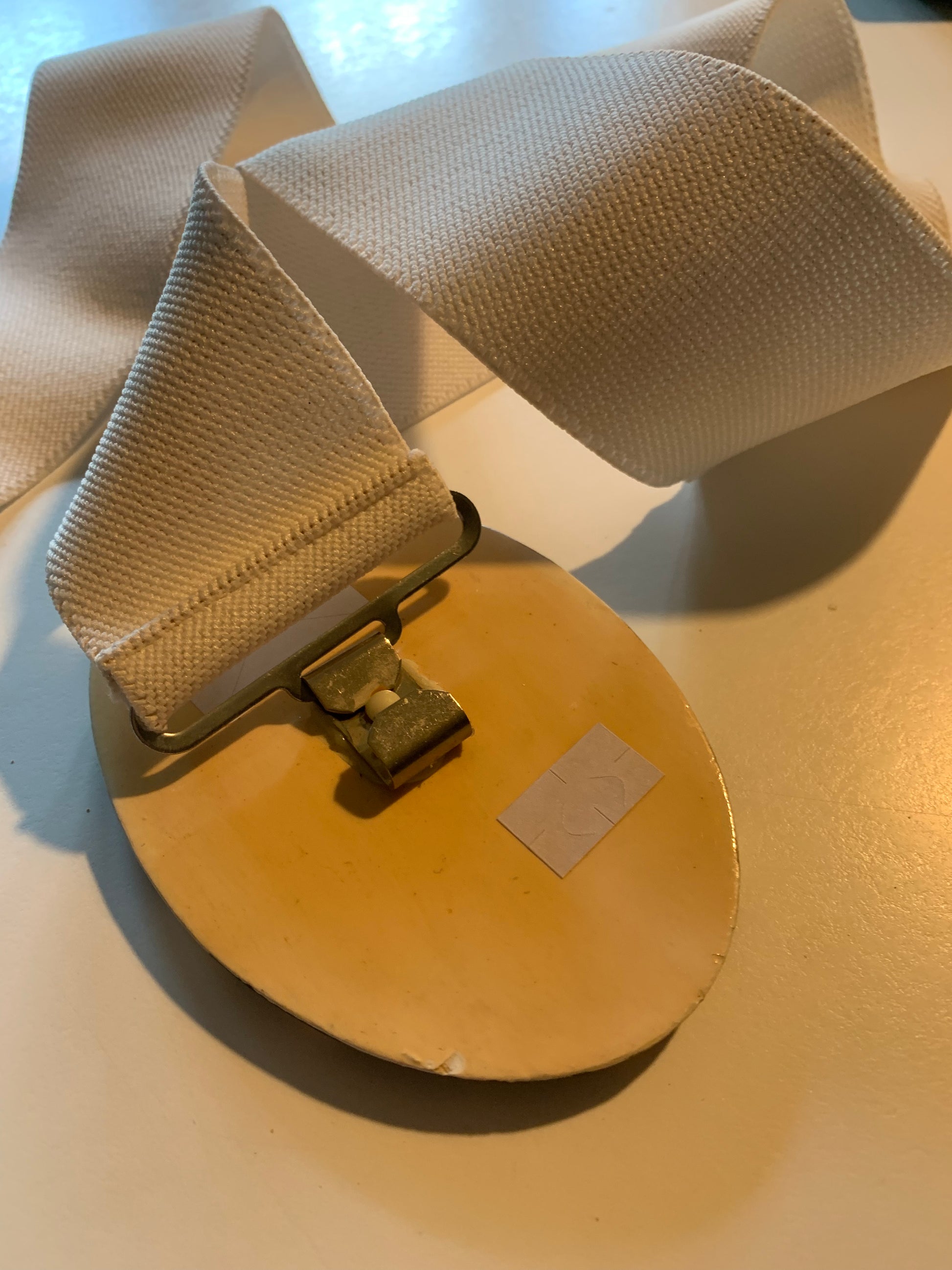 1980s white elastic wide belt with black and white checkerboard New Wave wooden oval clasp. 30-37" around, 2" wide