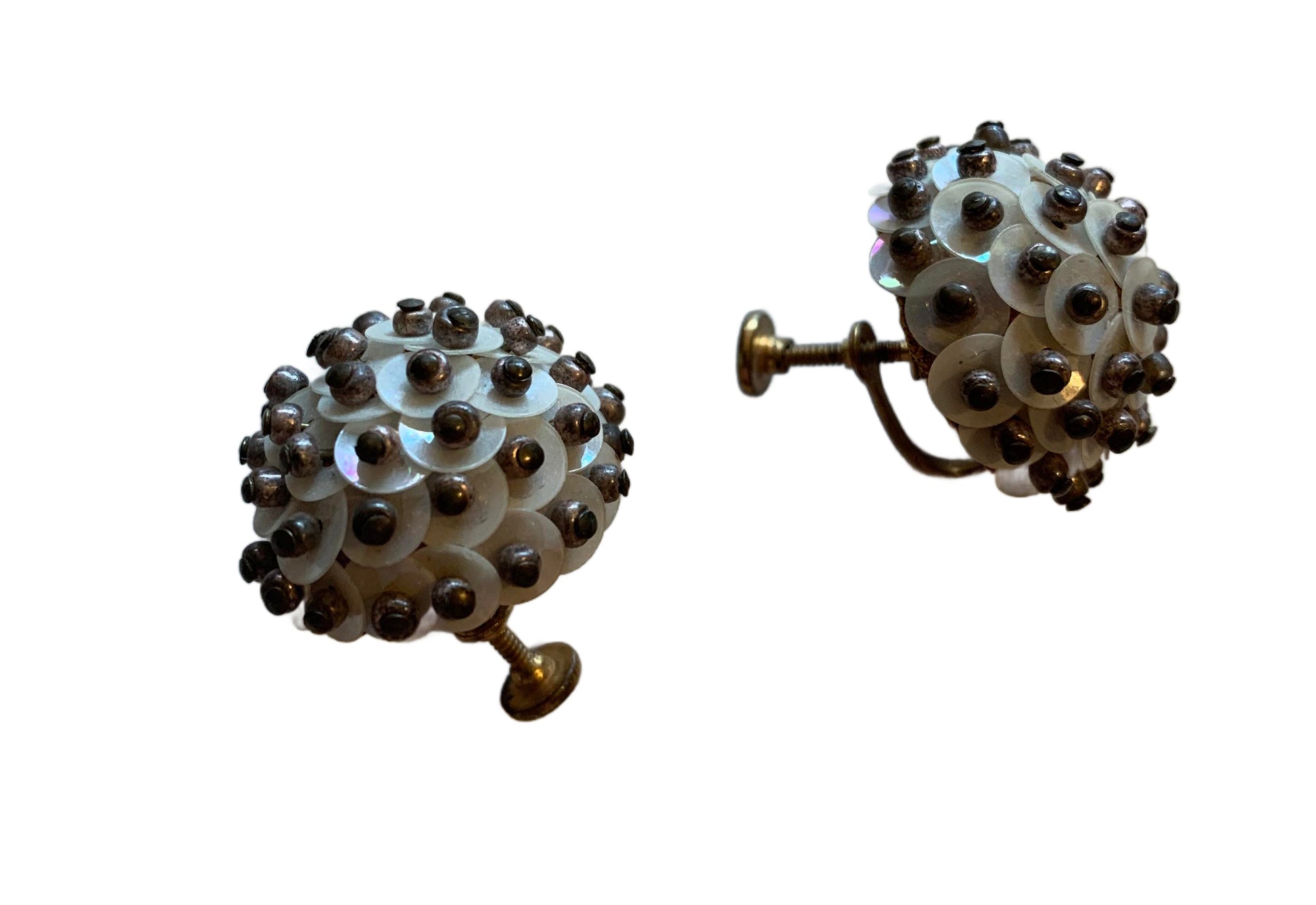 1940s winter white gelatin based sequin and bead domed screw back clip earrings. No markings, no flaws. 1" wide, 1/4" tall