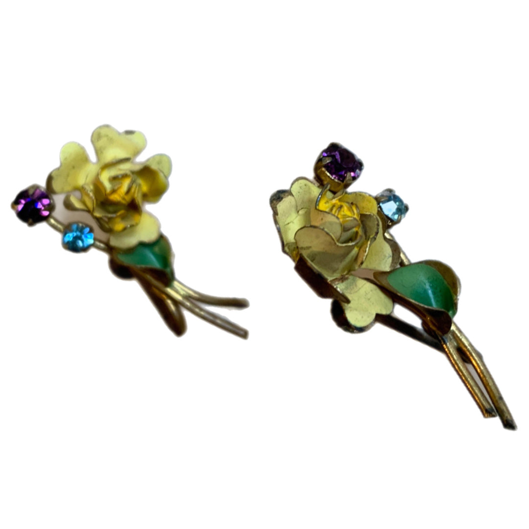 Yellow Rose and Purple & Blue Rhinestone Screw Back Metal Clip Earrings circa 1940s